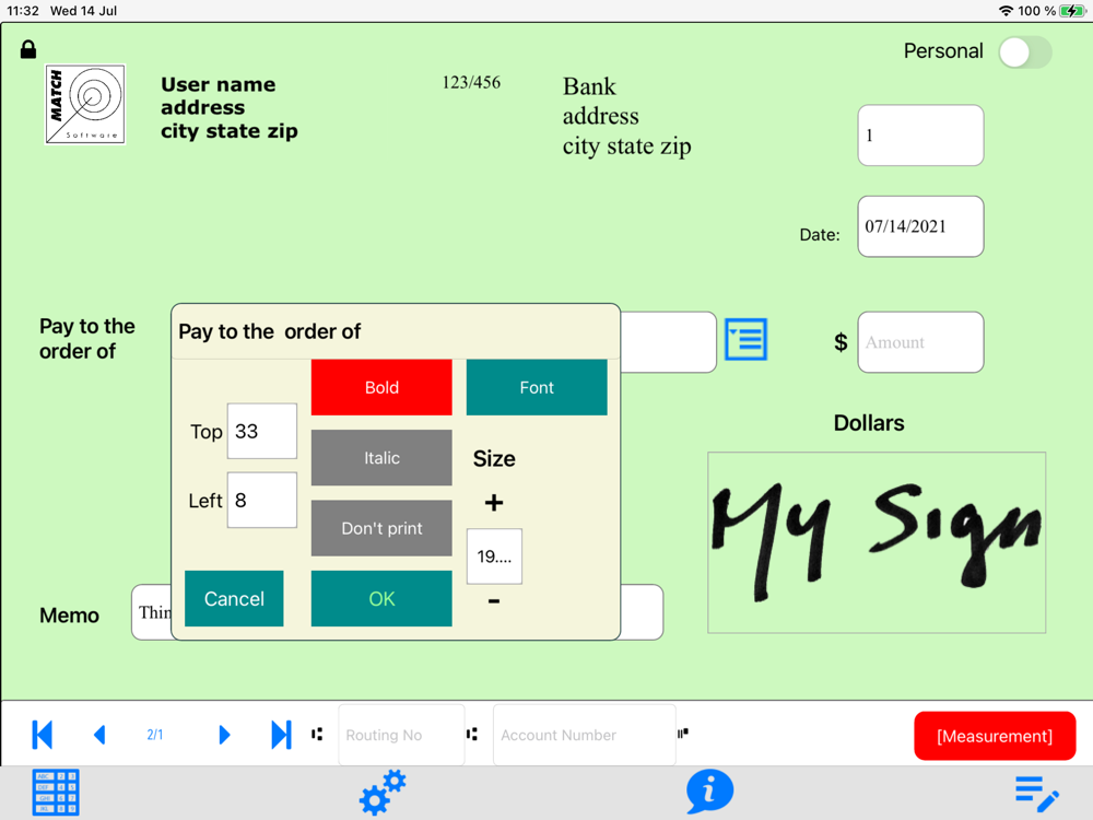 All elements of the check can be moved to perfectly fit your needs, and you can decide which elements will be printed (convenient for pre-printed paper).