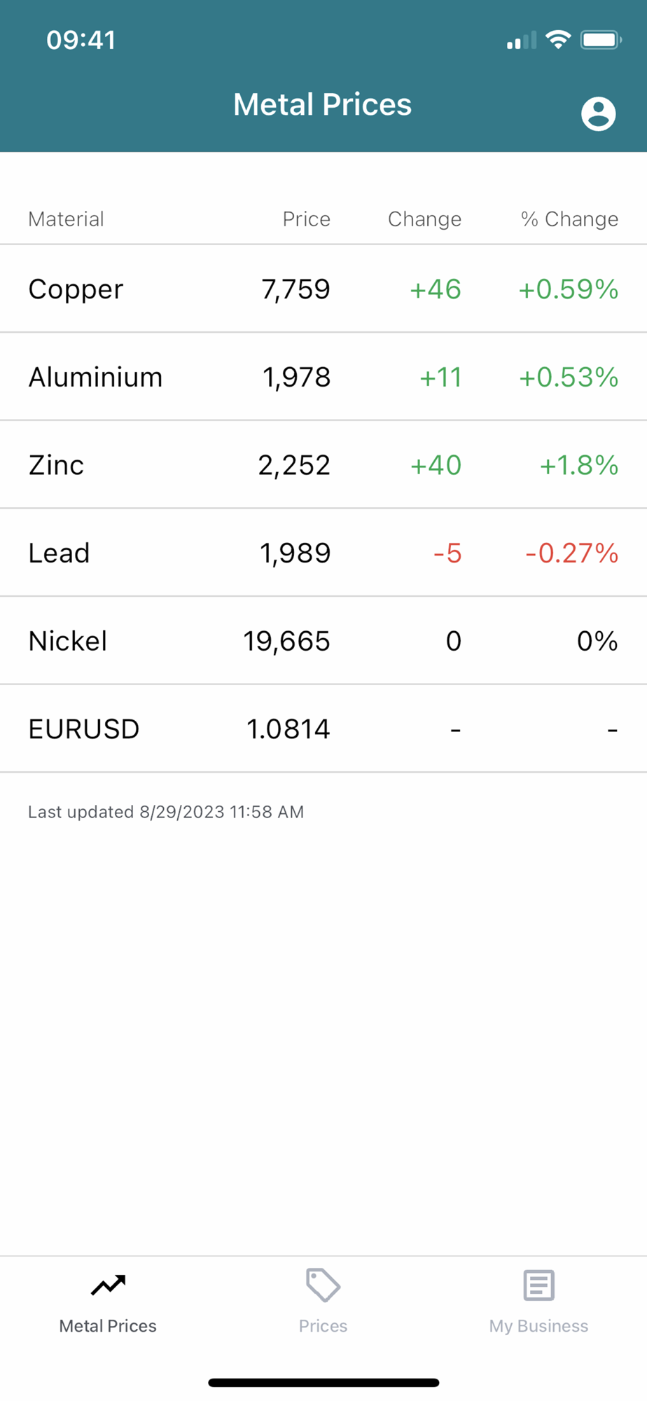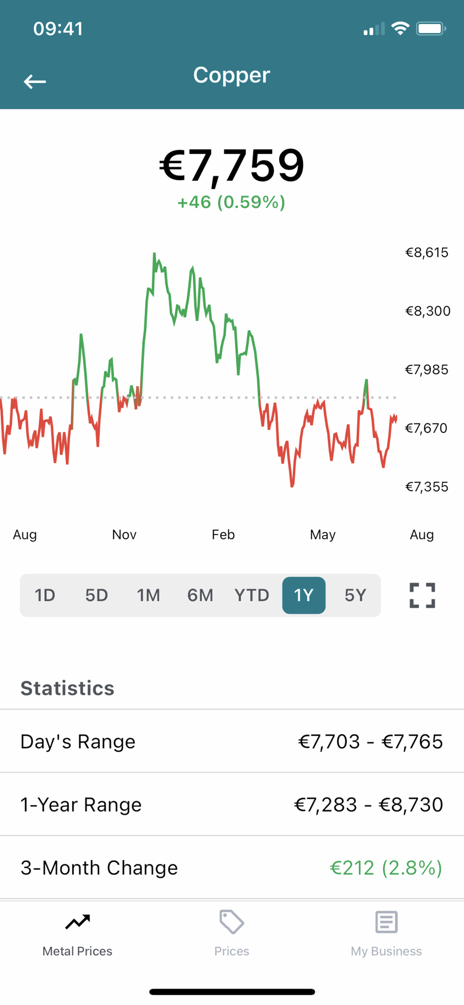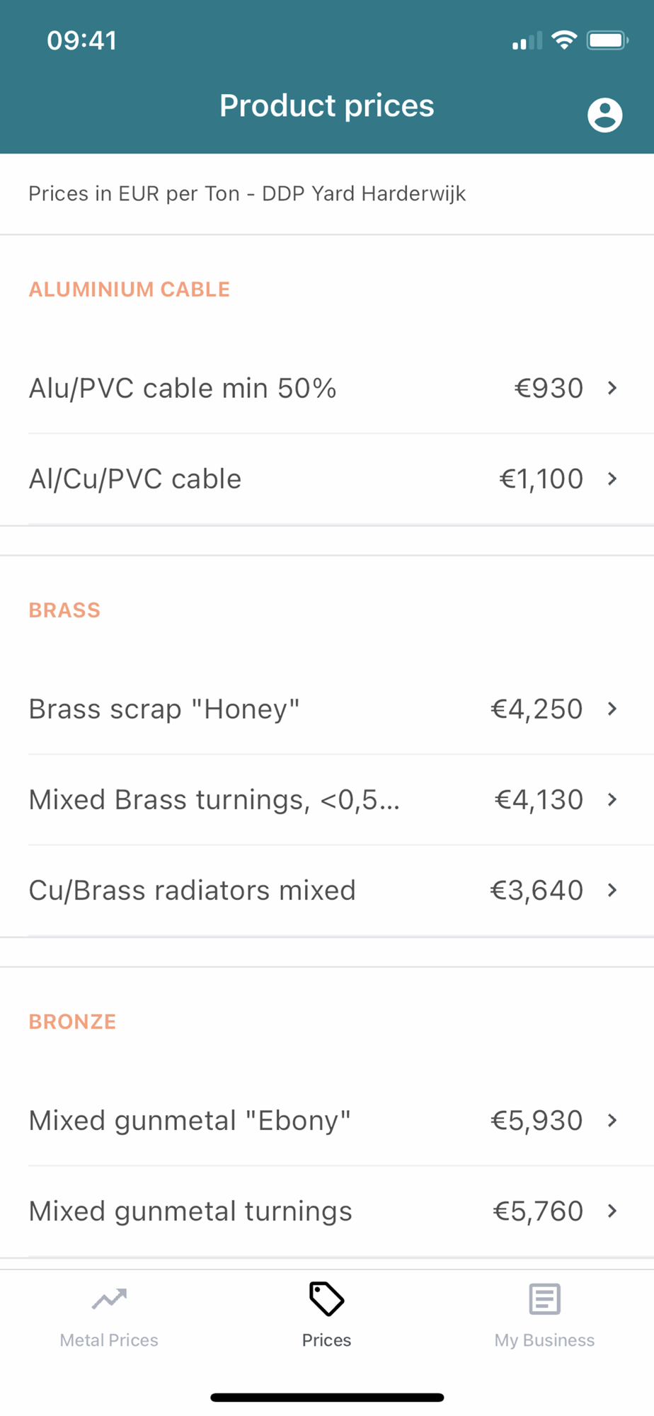 Would you like to see how metal prices are developing, or what price you can get for your scrap metals? myMyne lets you check the latest prices and your price list in the app. View the price history and see how the metal prices have been moving lately. Price alerts will keep you updated when a product price hits your target price, so you can buy or sell at the desired prices.