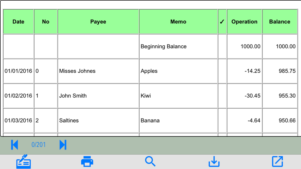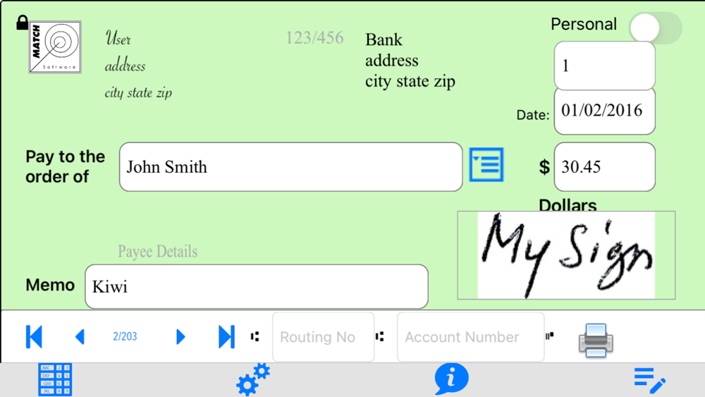 Keep track of all your expenses and deposits with the built-in electronic record book (Register). Balance is calculated automatically. Reconcile with your bank statement just as easily as you would with a paper record book. Save, load data and settings to use different accounts. Set different fonts to print your name on checks.