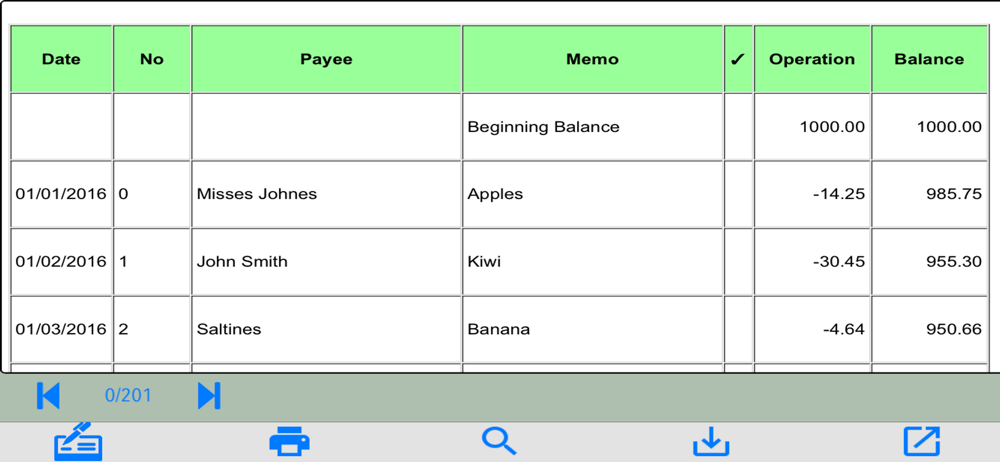 The Register can be printed in spreadsheet format. Search easily throughout the register content: date, number, memo, amount.