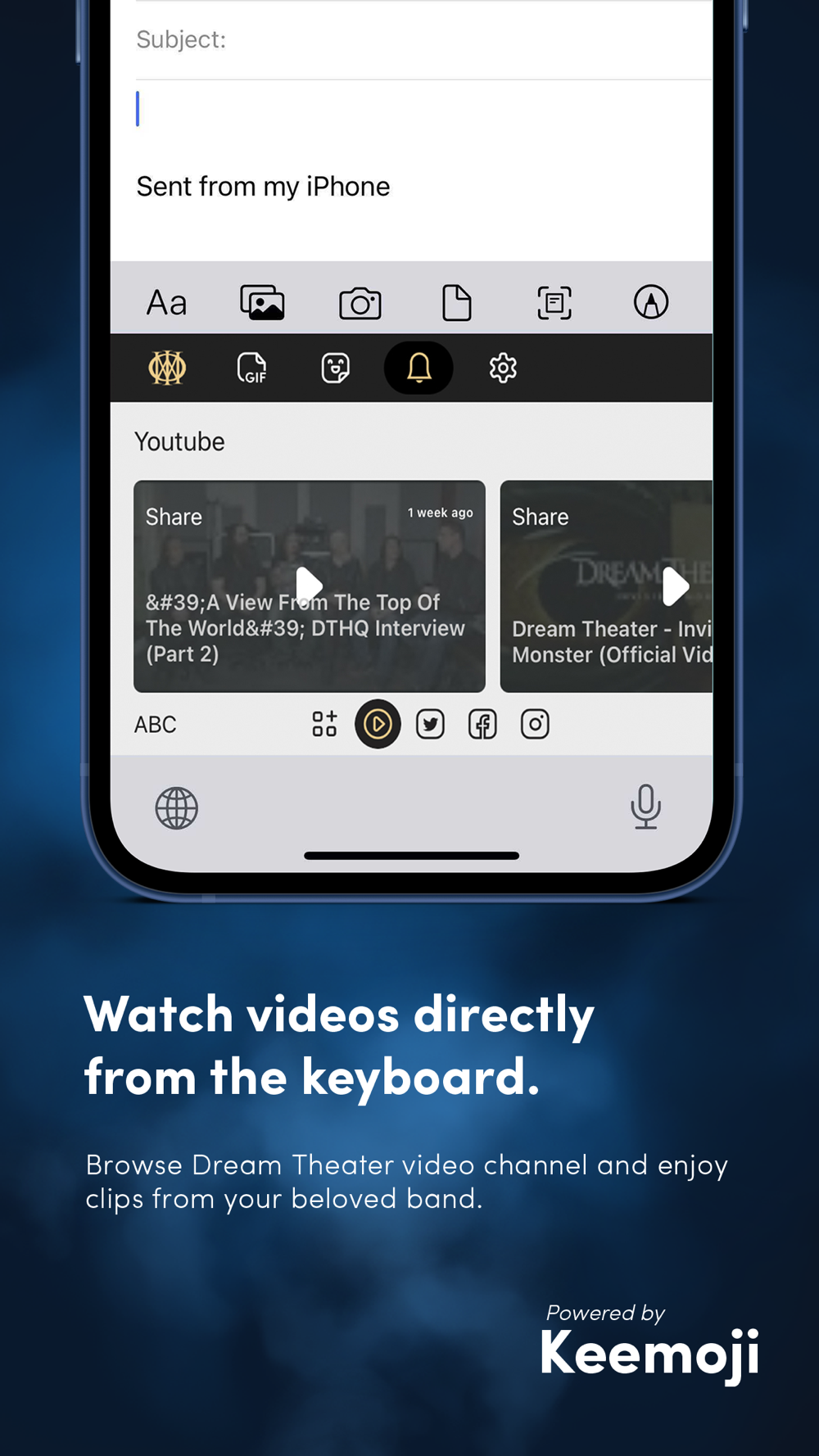 Download the Dream Theater keyboard now and enjoy a custom keyboard while showing your support for one of the biggest names in the progressive metal genre. Get updates from the band and watch their videos directly from your keyboard app! All this while personalizing your phone and enjoying a unique texting experience with custom stickers and cool emojis.