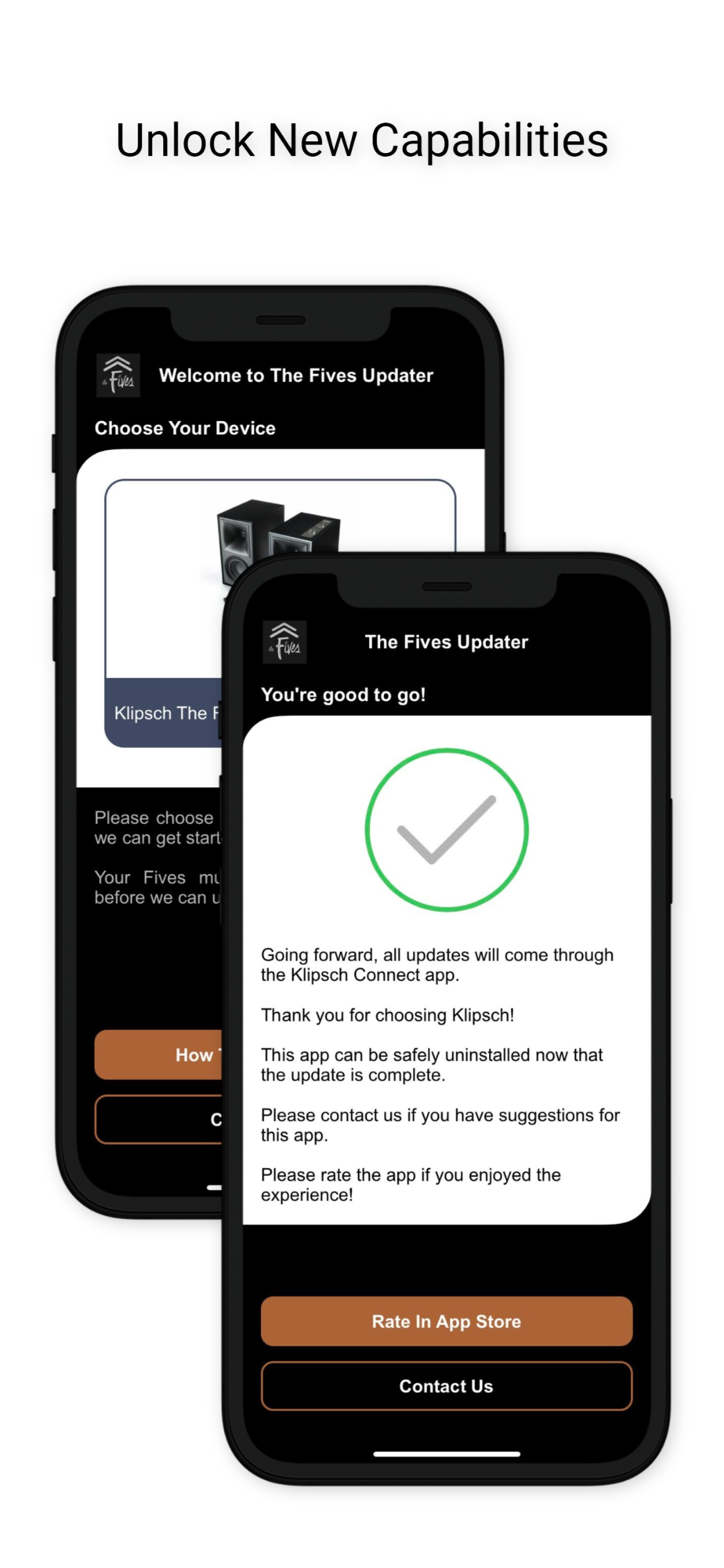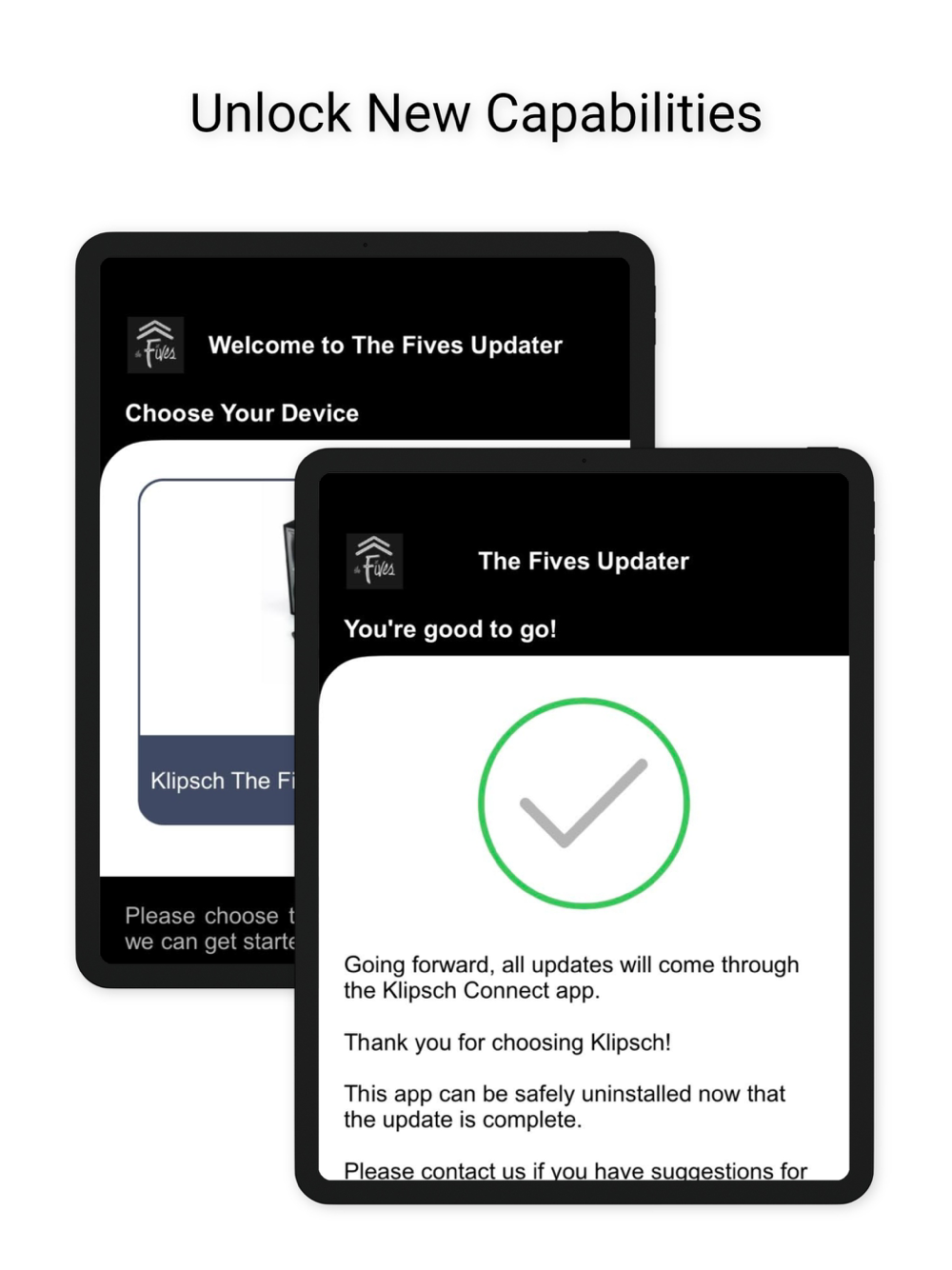 After you have successfully updated your Fives, you can safely uninstall this app. All future updates will come through the Klipsch Connect app.