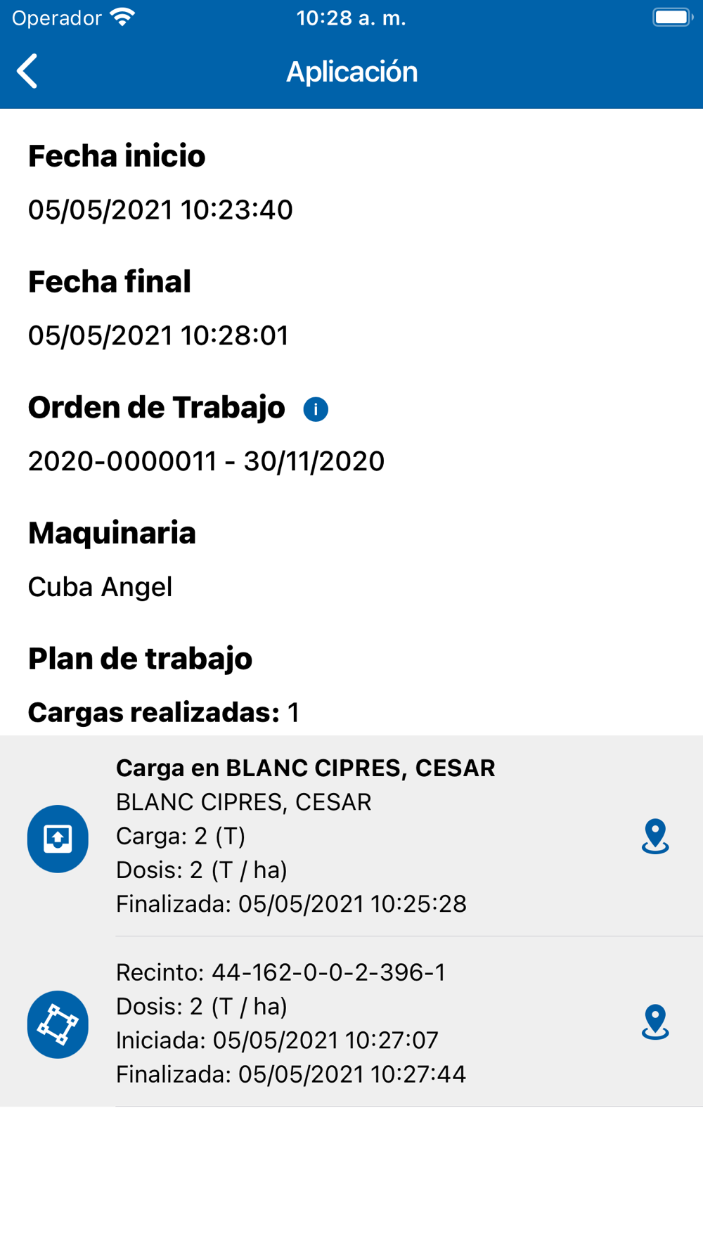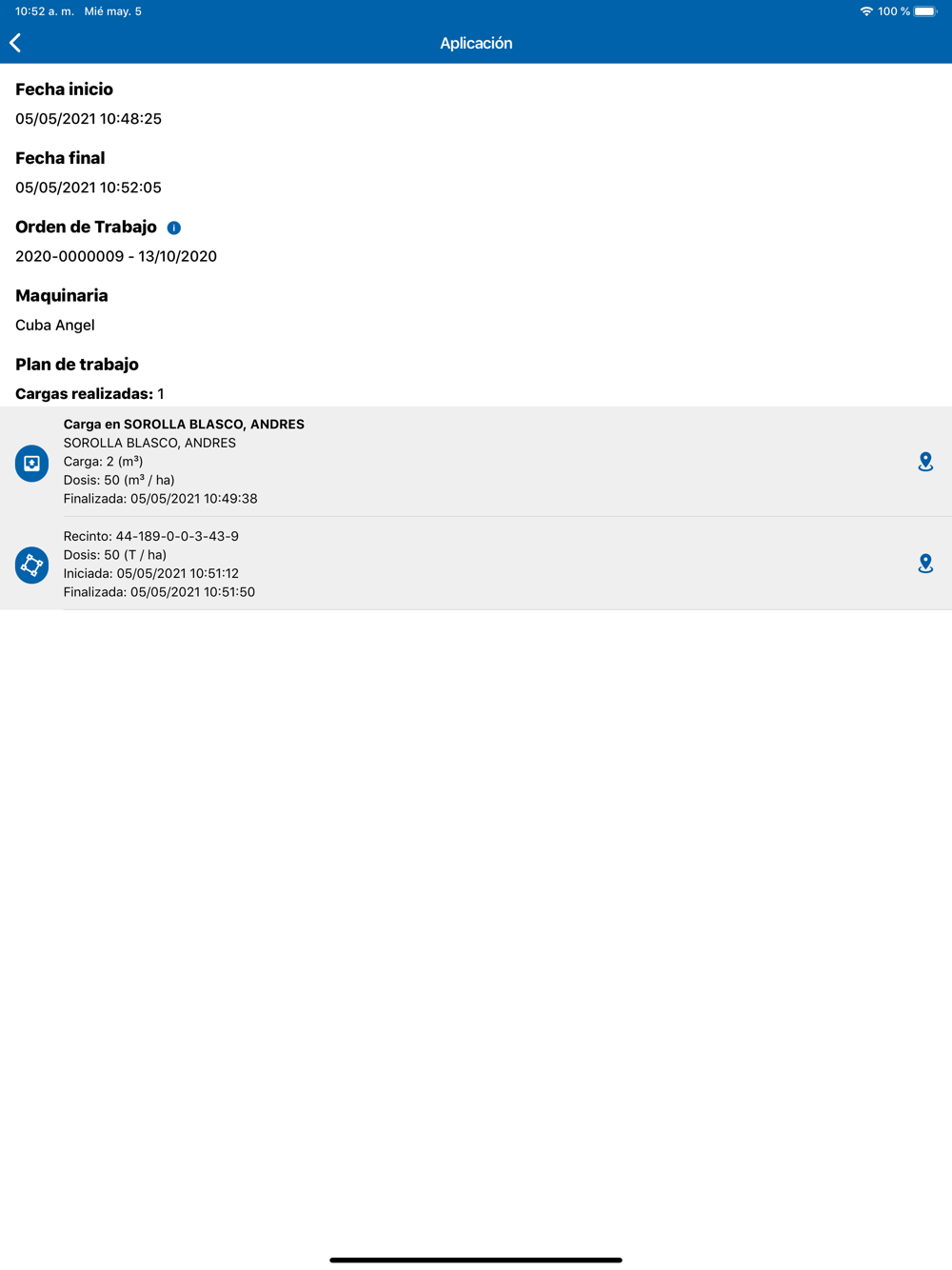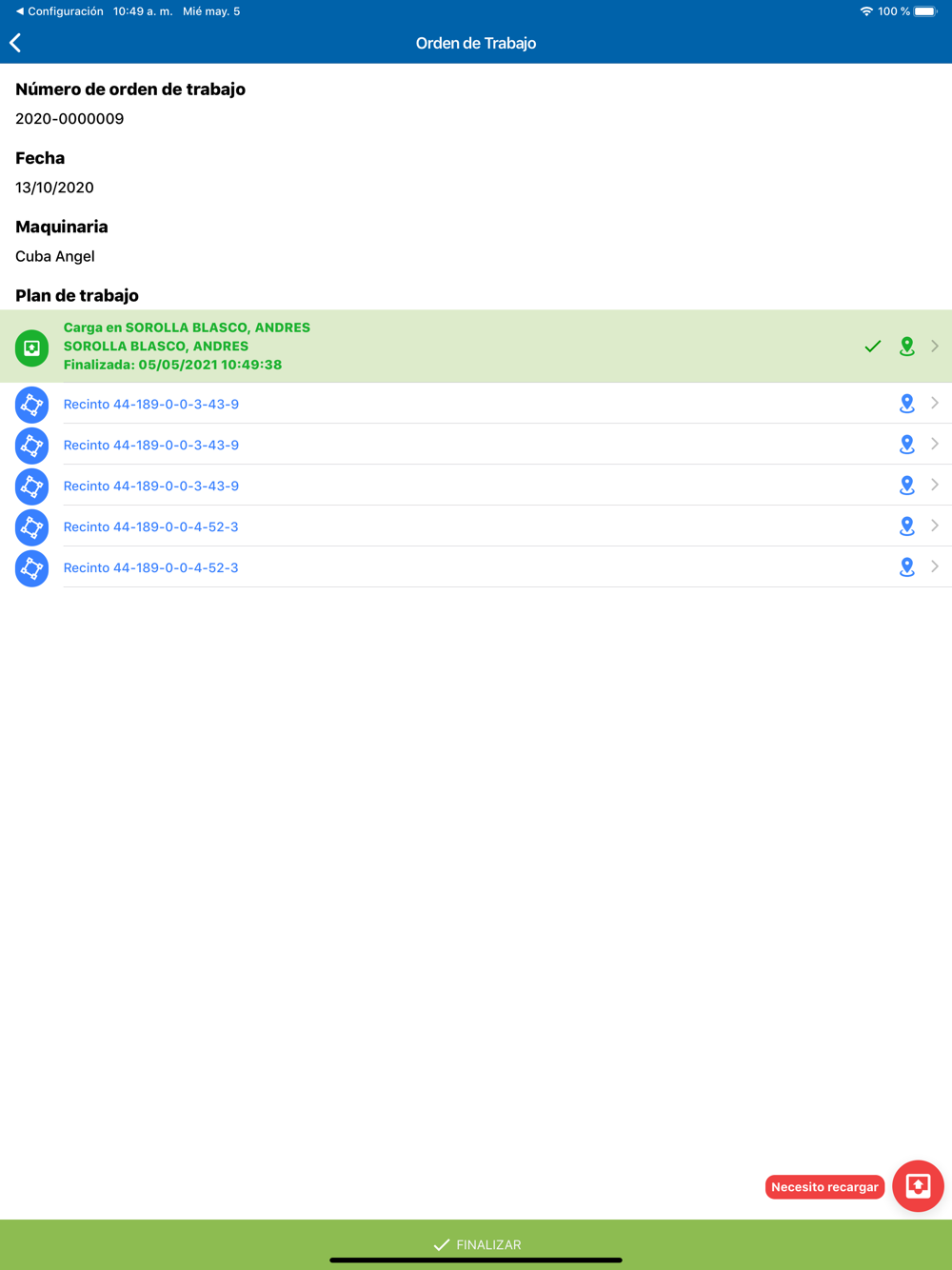 3. En cada orden de trabajo recibirás toda la información que necesitas para trabajar: planificación de cargas, parcelas en las que aplicar, dosis, cantidades, maquinaria, etc.