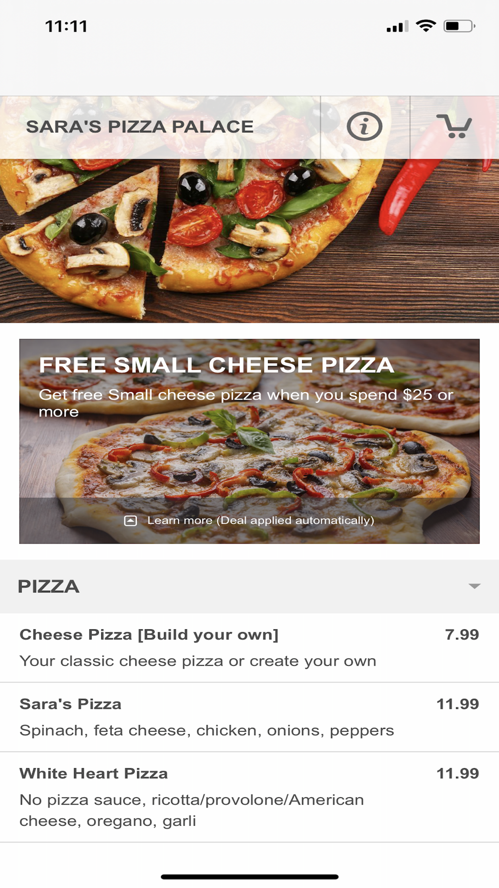 Use the Sara's Pizza Palace app to browse all the available items at Sara's Pizza Palace, select and add them to cart, and purchase online for a home delivery!