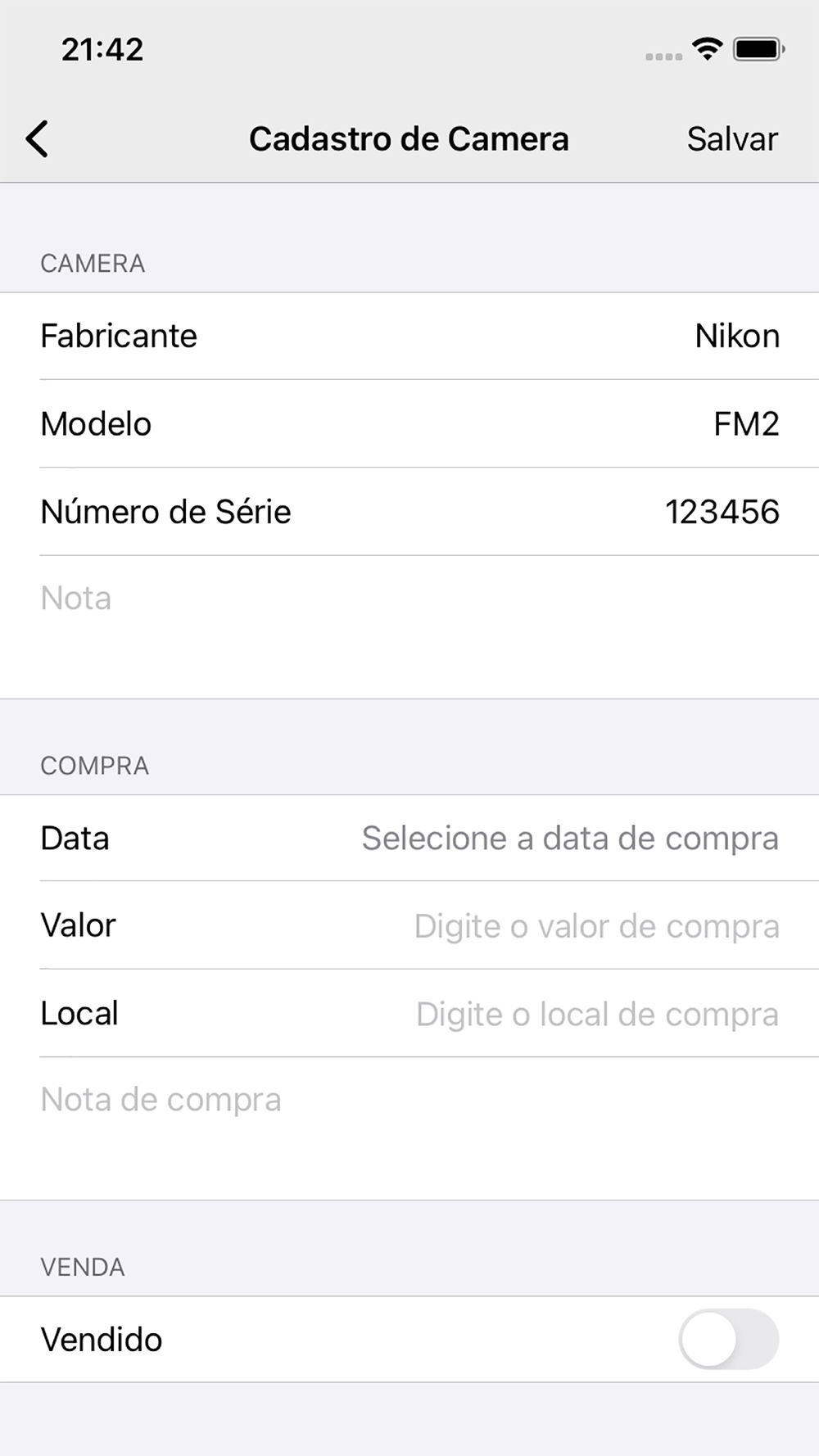 Controle seus equipamentos fotogrficos! Cadastre seu equipamento, nmero de srie, dados de compra e venda e muito mais.