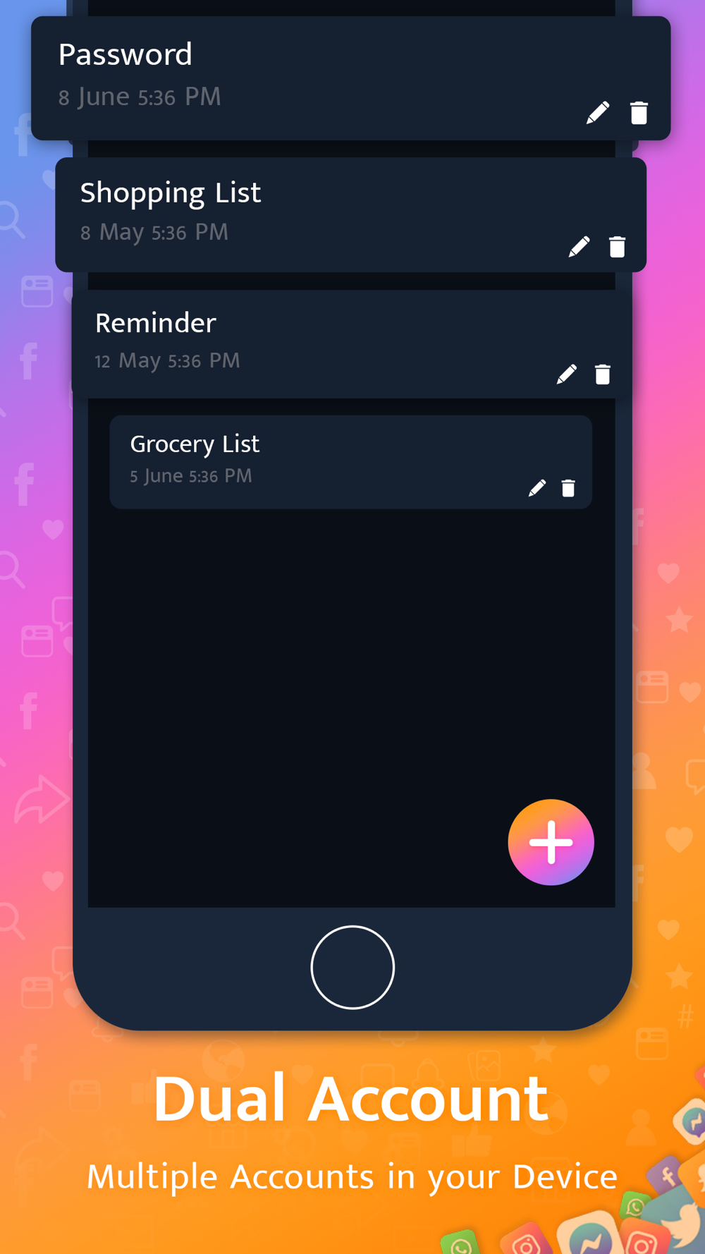 Dual Space Multiple Account in one device. If you are actively using 5 or 10 social media like Facebook, LinkedIn, Twitter, Instagram, Google+, Pinterest etc, then you need to install individual apps for each social media in your mobile device.