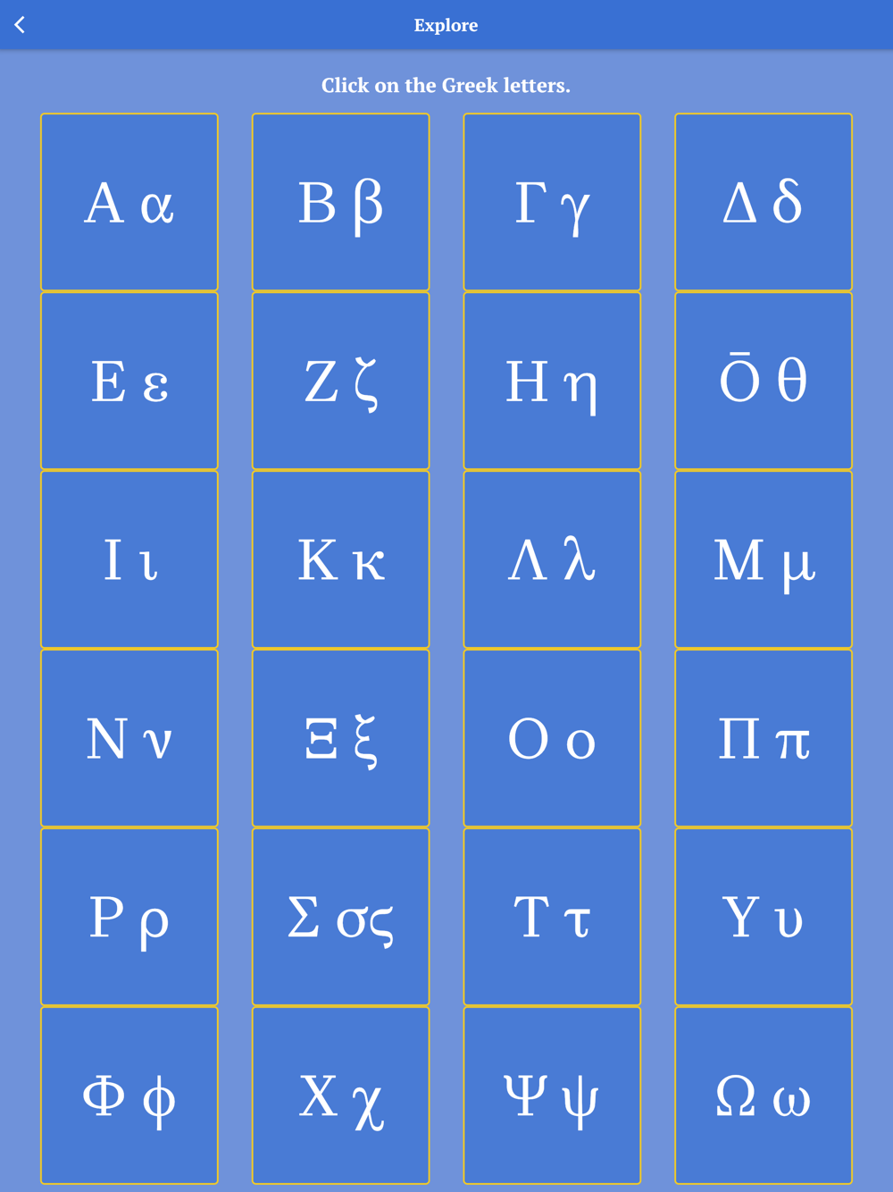 - the Explore page allows users to see all the letters of the Greek alphabet (upper- and lowercase) and click on them to see their English names and listen to their pronunciation.