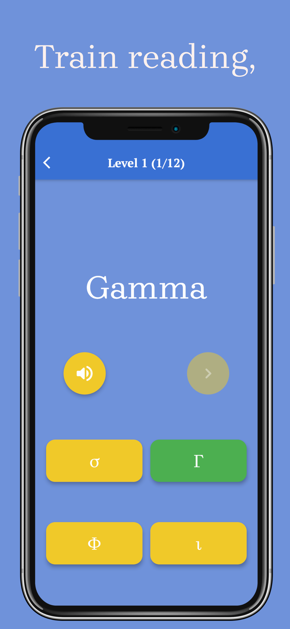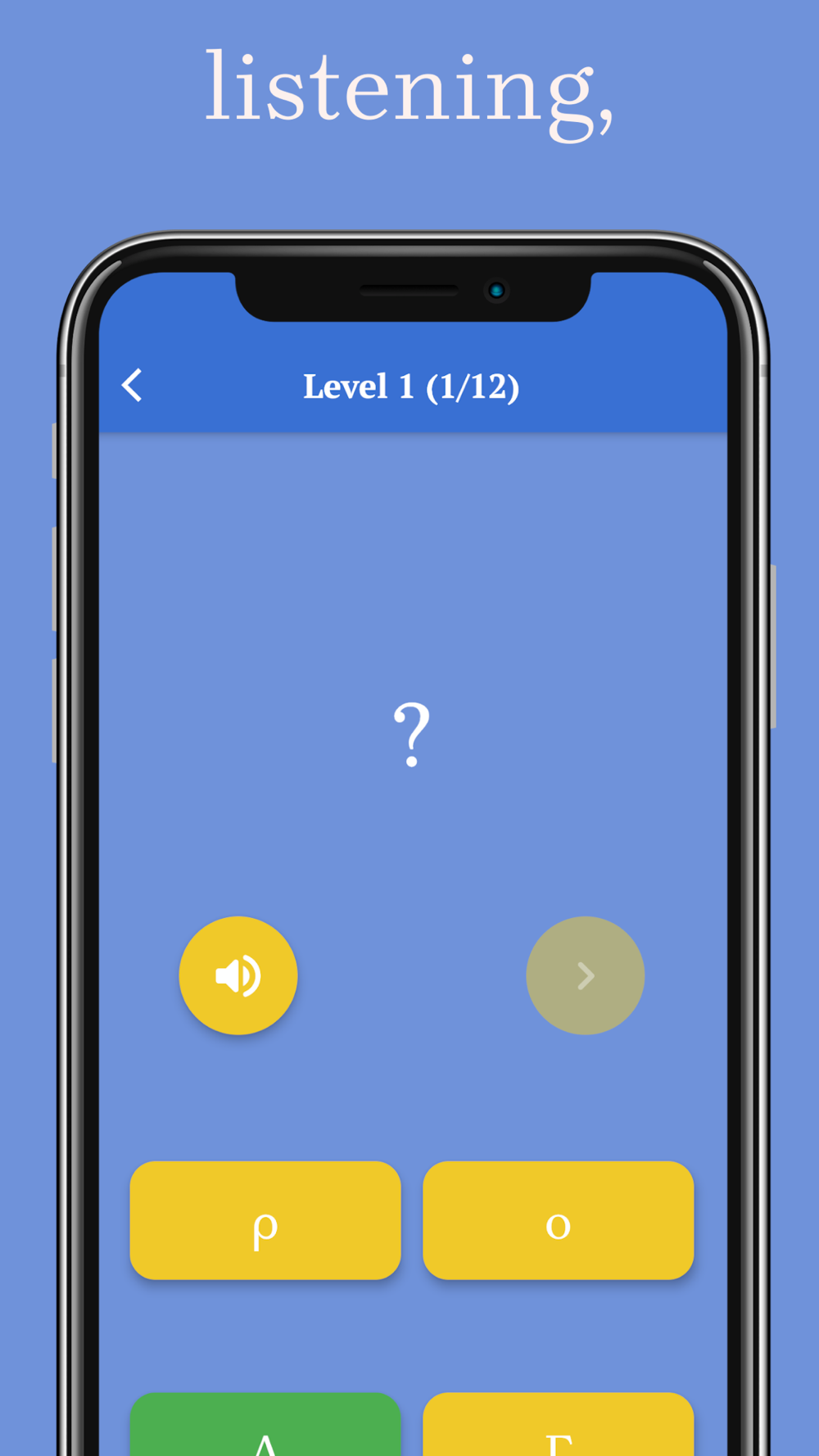 In the Reading mode, you can learn the letters from Greek to English or from English to Greek. At the beginning of each level, four letters are introduced one by one and you should try your best to remember them. After going through 4 learning cards, you will start a quiz game, which trains and enhances your knowledge. Along the way, you can always listen to the English pronunciation of the letters.