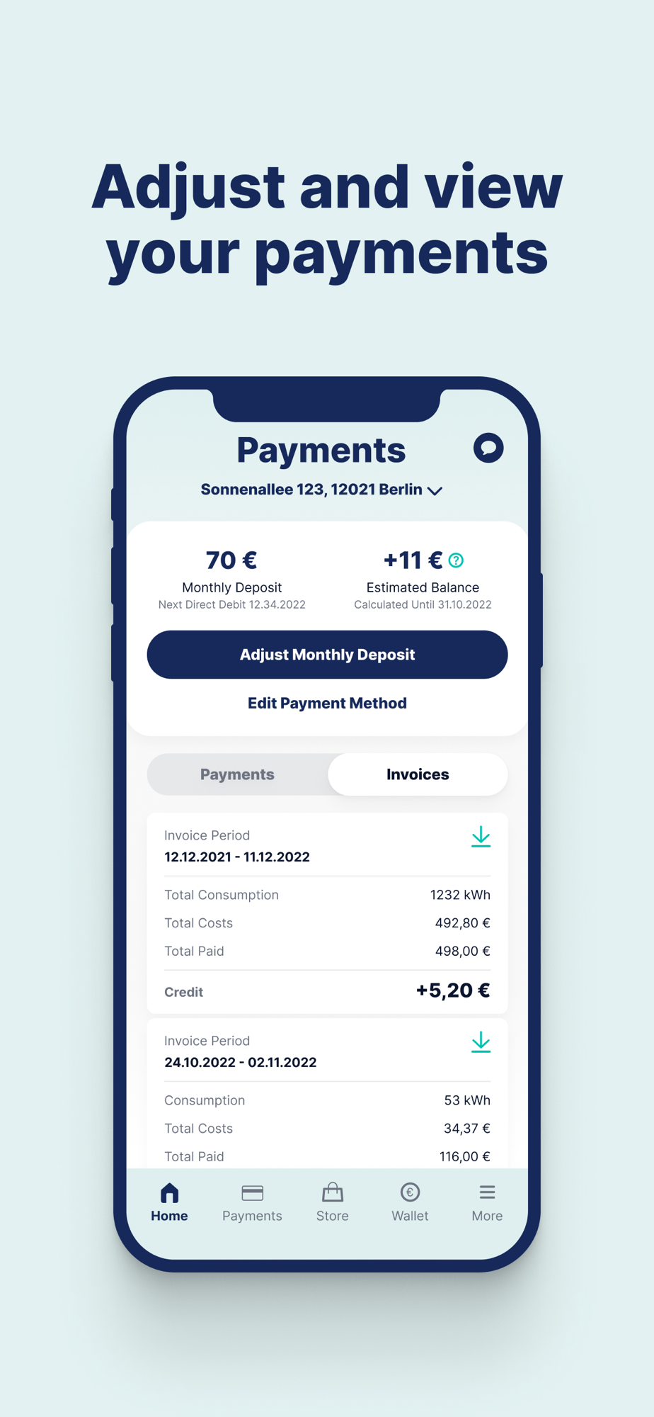 Experienced a surge in power usage this month? Fine-tune your monthly deposit directly within the app, steering clear of any end-of-year additional charges. Browse through all your invoices, payments, and customize your payment method – all under one roof.