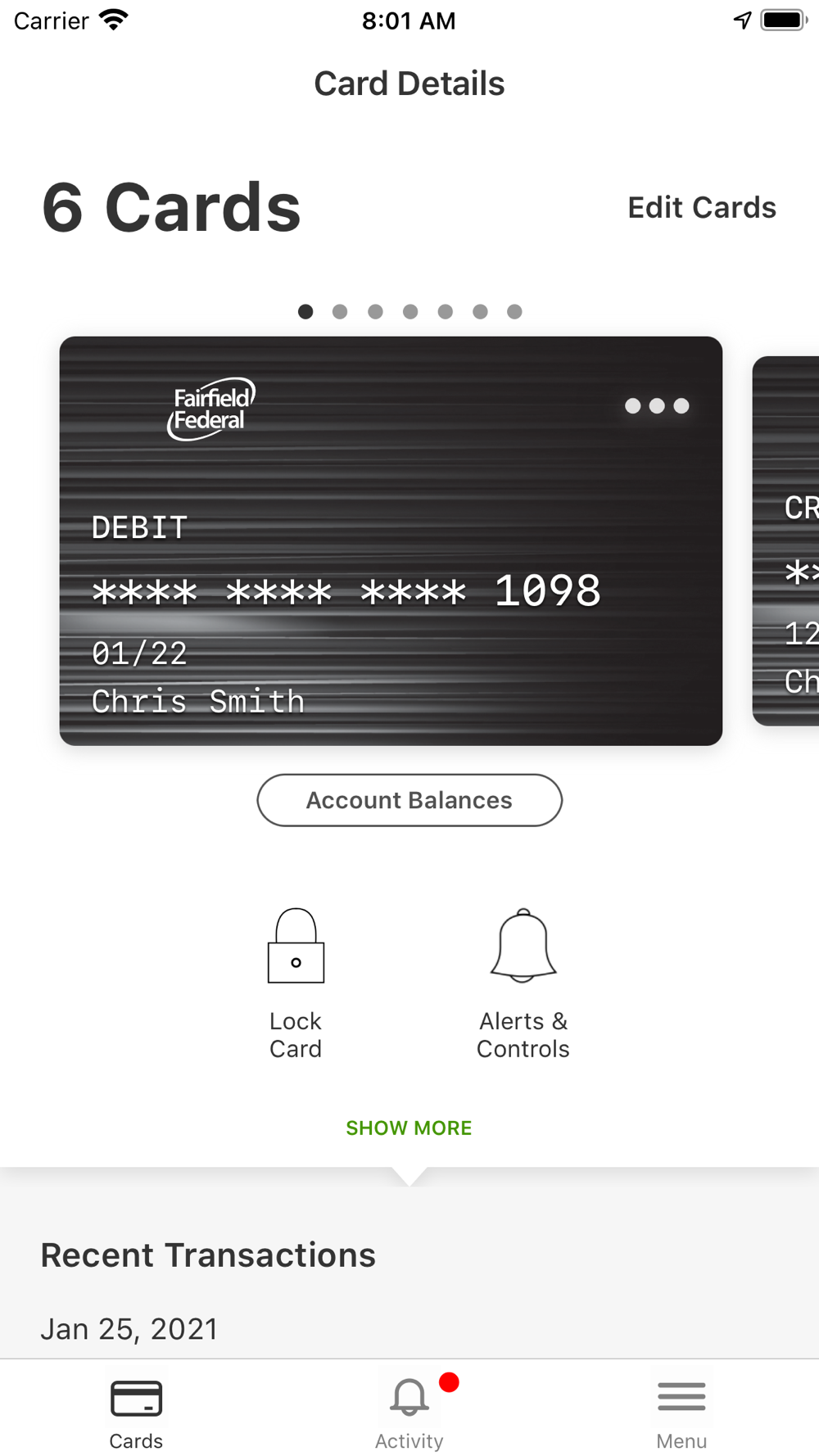 Fairfield Federal Card Control helps to protect your debit card by sending you transaction alerts and giving you the ability to define when, where and how your cards are used. Simply download the Card Control companion app to your smartphone, then customize your alert preferences and usage settings to monitor and manage your cards.