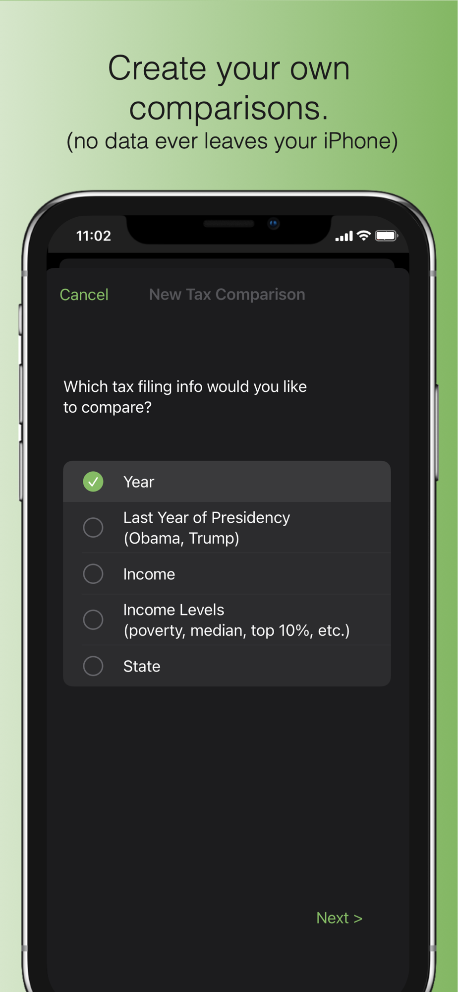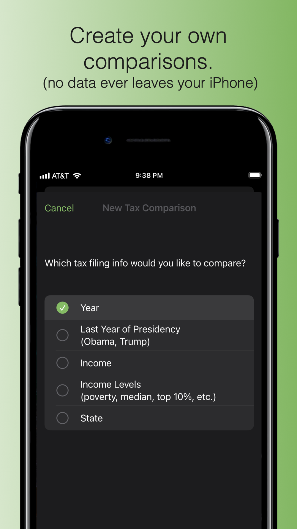 Easily compare U.S. federal and state taxes between years, states, incomes, or deductions with just a few taps. See how taxes were impacted by presidential administrations. Quickly check how your taxes would change if you lived in a different state. Tap on the numbers to see the detailed calculations.