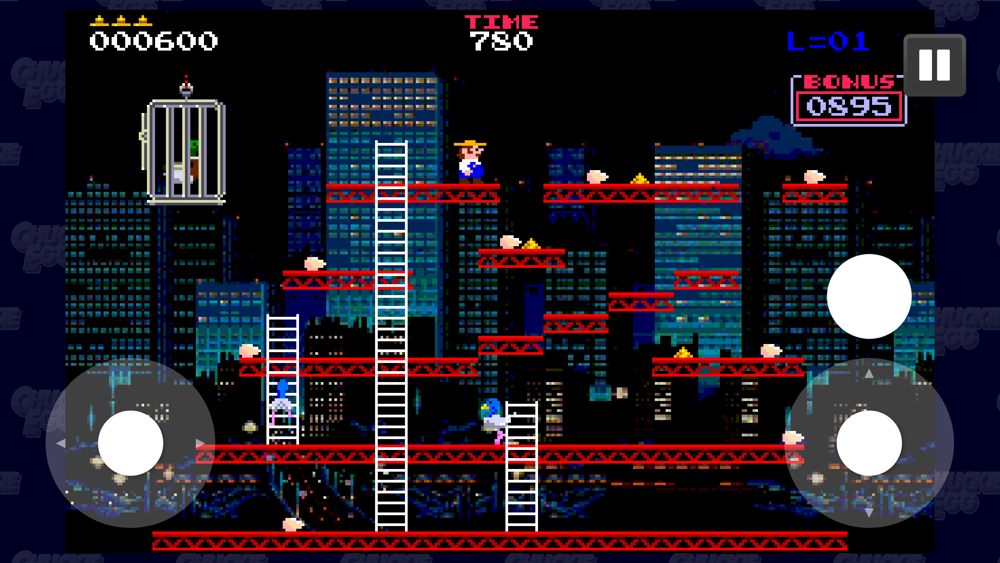 Eight levels are defined and are played initially under the watch of a giant caged duck. Upon completion of all eight the levels are played again without hens, but Harry is now pursued by the freed duck who is not affected by the positioning of platforms. A second completion of all eight levels yields a third play through with both ostriches and the duck. A fourth pass introduces additional ostriches. Finally, a fifth pass has the duck and additional ostriches moving at a greater speed. If the player completes all forty levels then they advance to 'level 41' which is in fact exactly the same as level 33.