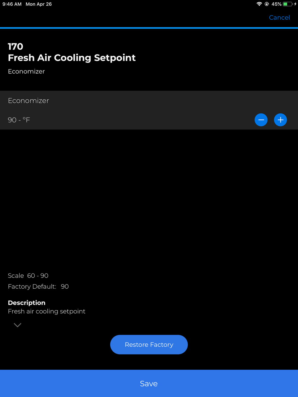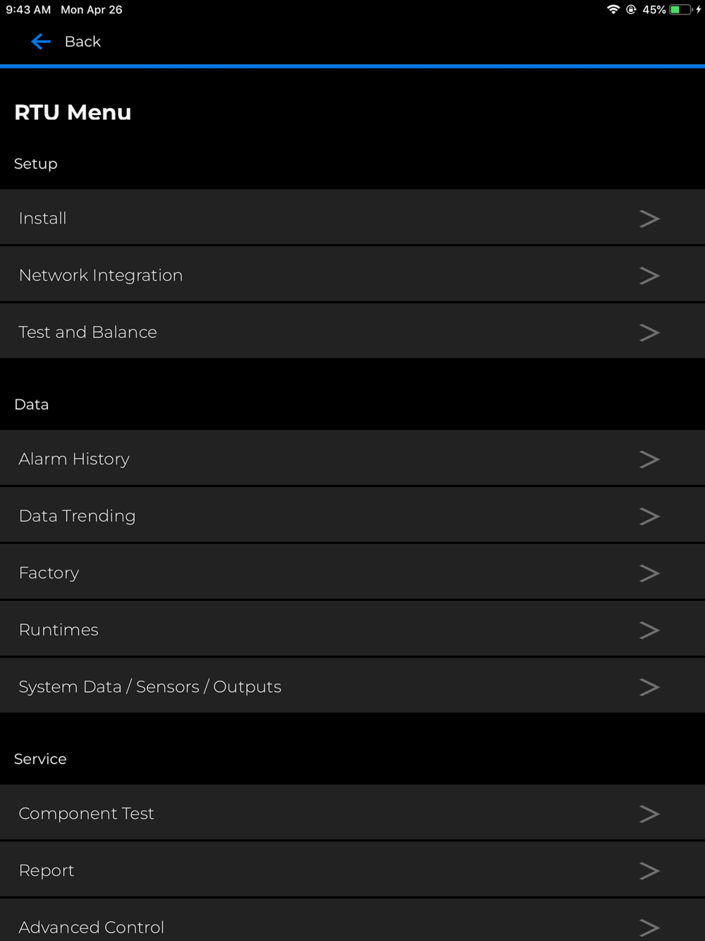 This app is intended for commercial HVAC service technicians to interface with CORE Unit Controller equipped unitary packaged rooftop units.