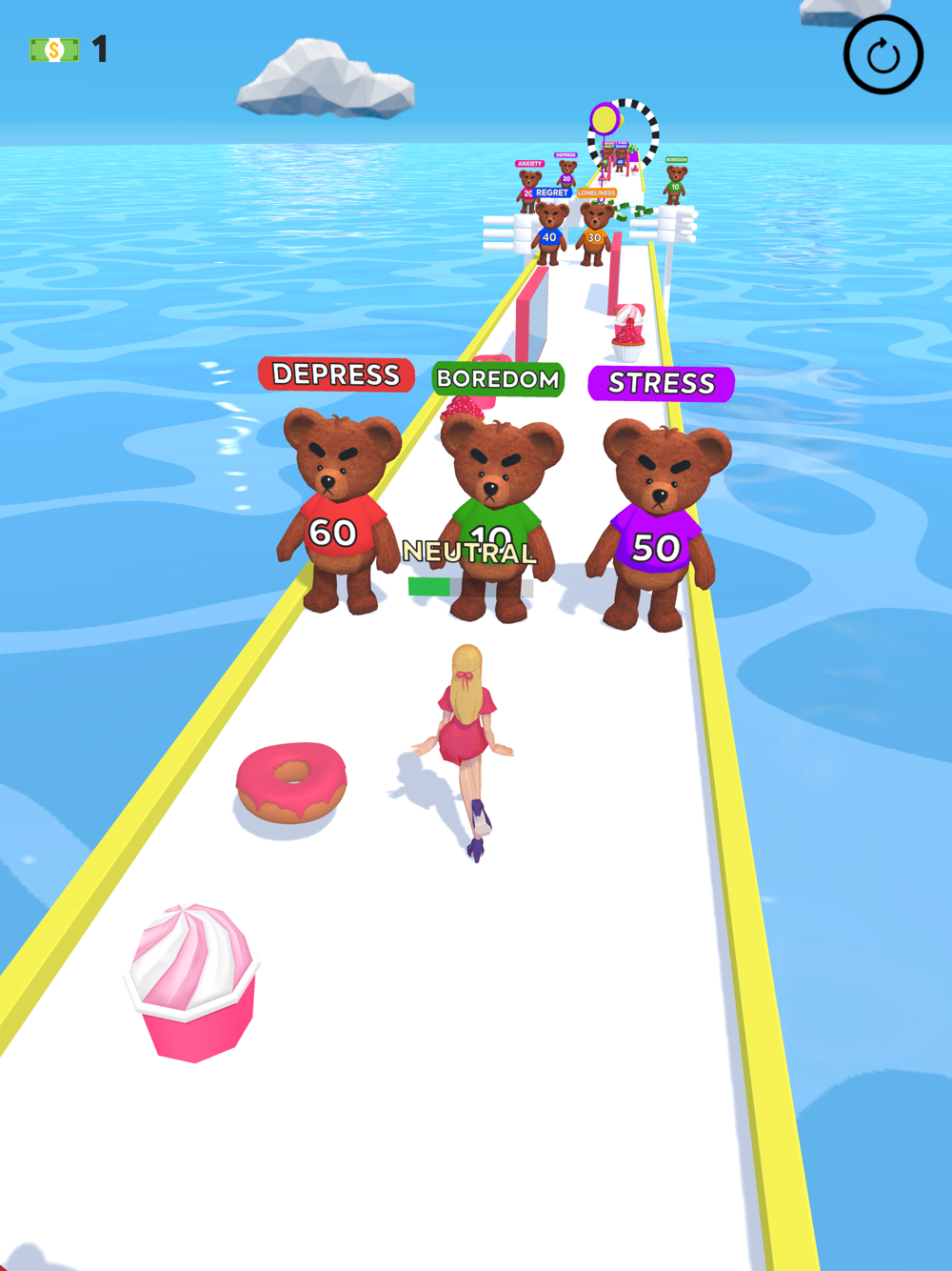 Try to remain happy by avoiding negative teddy bears and collecting desserts on the platform.