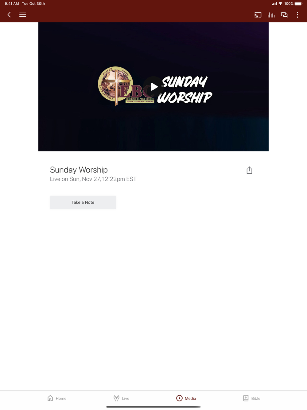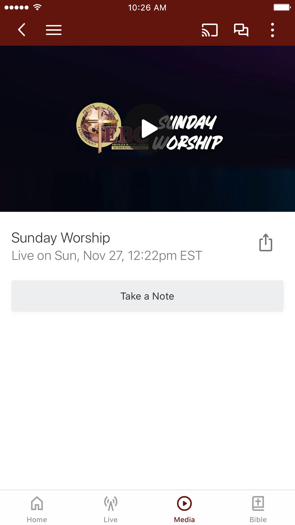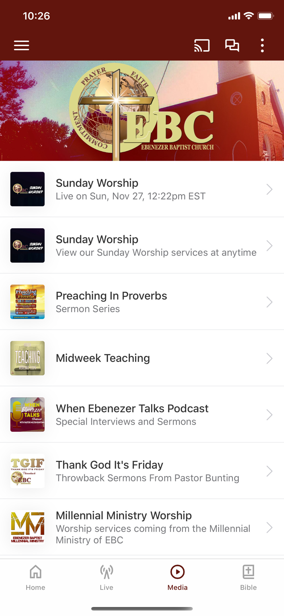 The Official App of Ebenezer Baptist Church (EBC). This all-new version is completely built from the ground up to provide you with the most relevant and up-to-date content from Ebenezer Baptist Church. The Ebenezer Baptist Church app is the ultimate mobile church app. Podcasting, reading and listening to the Word of God will become so easy with the Ebenezer Baptist Church app. Quick tabs make it easy to quickly find the passage you want to read. You will be able to stay connected with audio, video, devotionals, podcasts and a variety of resources from EBC. You will be able to Watch LIVE services from Ebenezer Baptist Church and stay updated on Ebenezer Baptist Church Video Broadcasts. This app will help believers and non-believers grow in their faith, and will provide easy access to life-changing audio and video sermons, upcoming events and relevant information about Ebenezer Baptist Church. Additionally, you will also be able to share content with your friends via Twitter, Facebook and email.