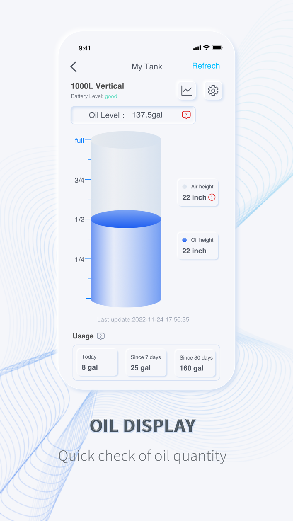 Usage record:Through the chart to record your heating oil usage on an hourly basis, you can use the chart to see how your heating oil is used in that day, week, month and year.