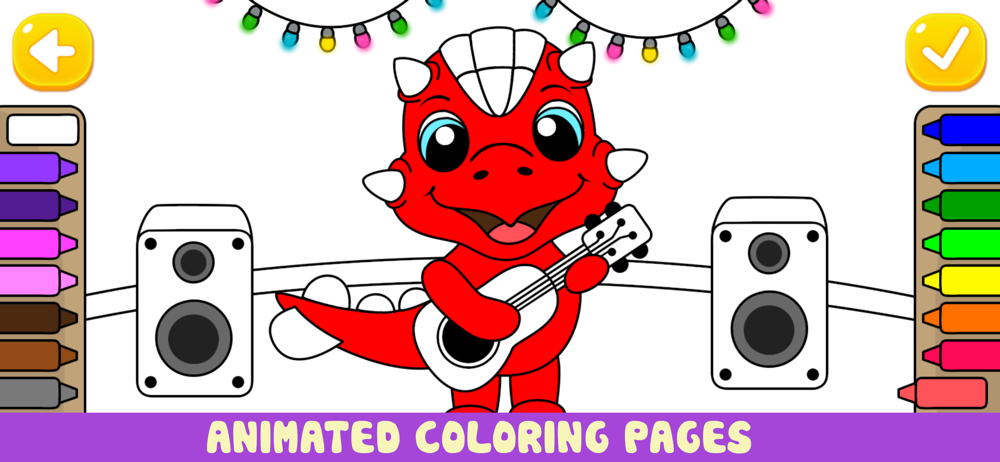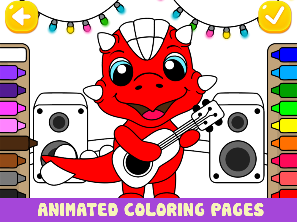 - every animated coloring page has an unique music songs like "Happy Birthday", "Little Fish", "Bath Song", etc. to enjoy your kid,