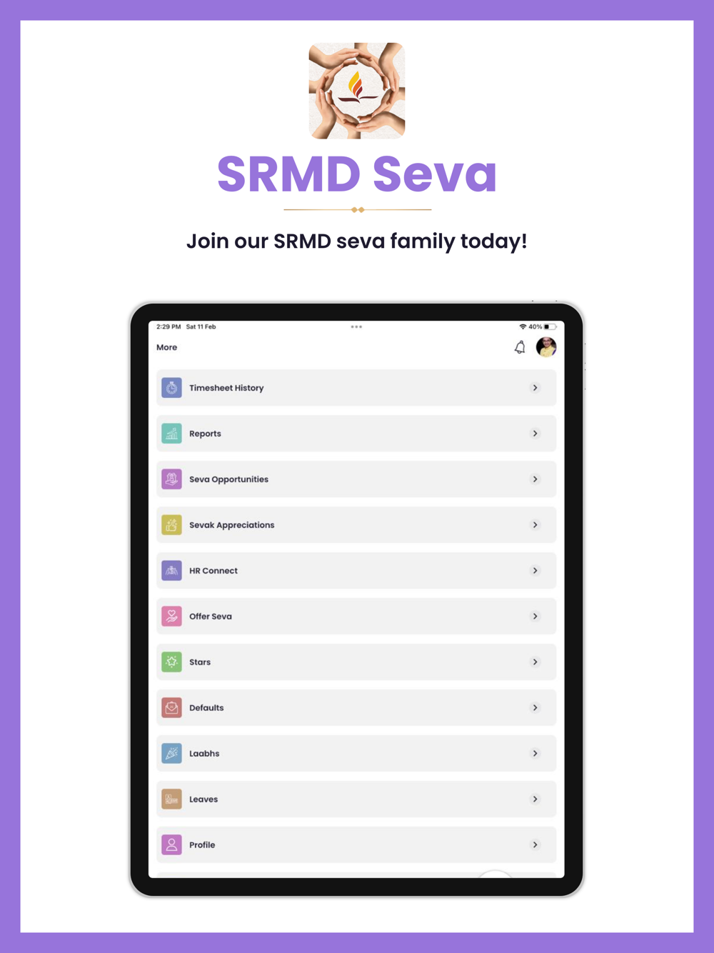 The SRMD Seva App is the official mobile application for offering & managing seva at Shrimad Rajchandra Mission, Dharampur. This app would be a medium to track, optimise and inspire seva