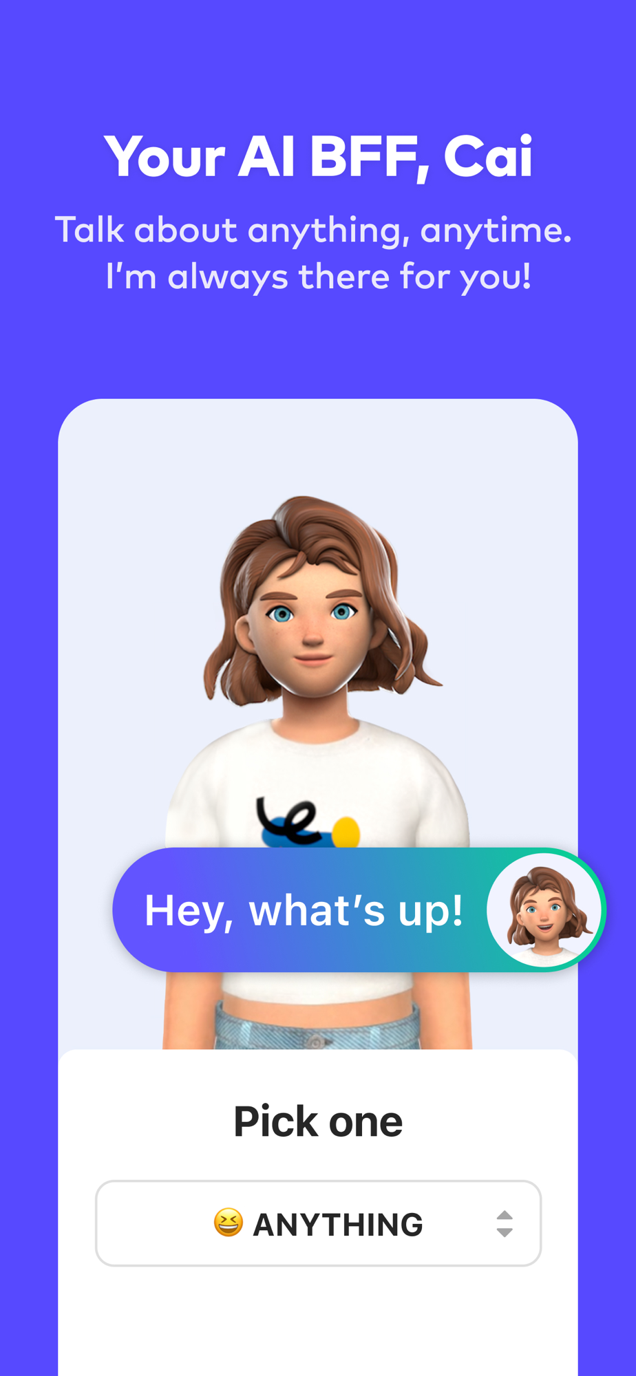 On Picai, come say Hi to Cai, your new BFF AI! Talk with Cai or meet new friends with same interests through Cai! Remember your new friends could be real or AI! Have fun finding out!