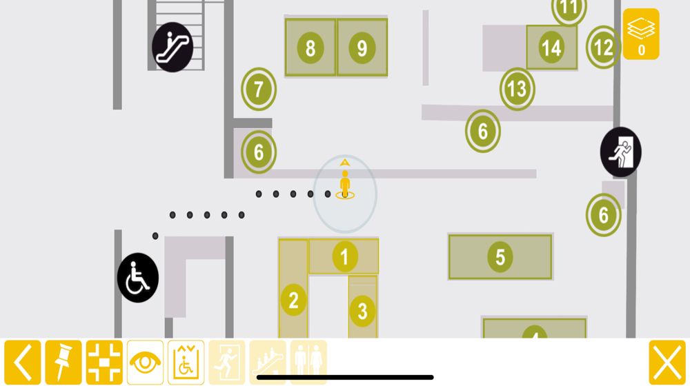 información práctica, como la ruta para llegar a los ascensores, aseos y a la