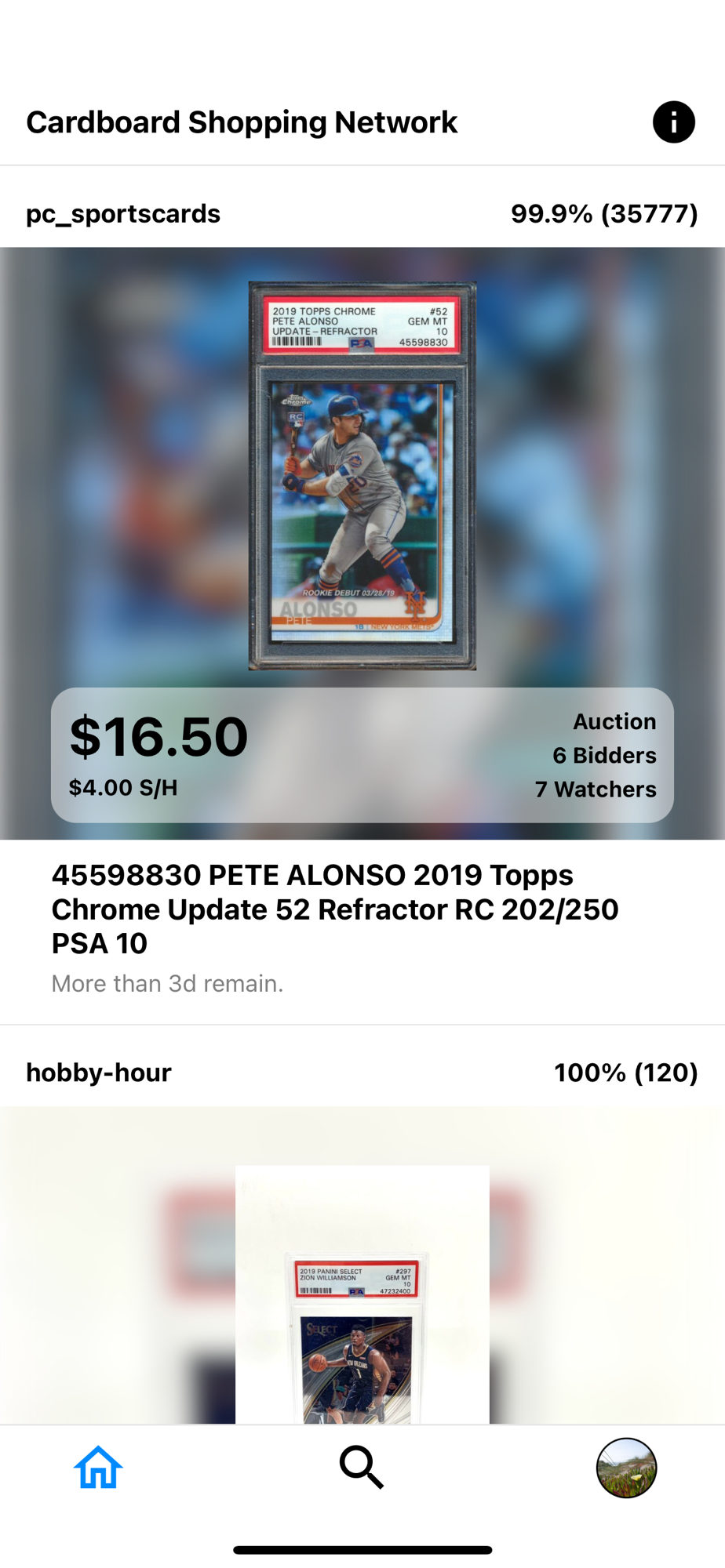The Cardboard Shopping Network makes it easy to find the cards you are looking to purchase. As of right now, you can search for eBay items for sale, click on the items and be sent right into eBay to bid, purchase, and send as offer to the seller.