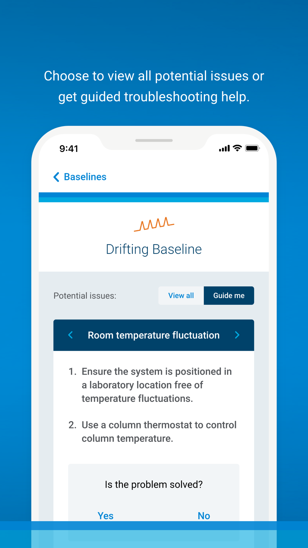 For each problem, you can choose to view all potential issues for tips or get guided step-by-step help to troubleshoot your issue. This flexible app offers two ways to help users solve their HPLC problems.