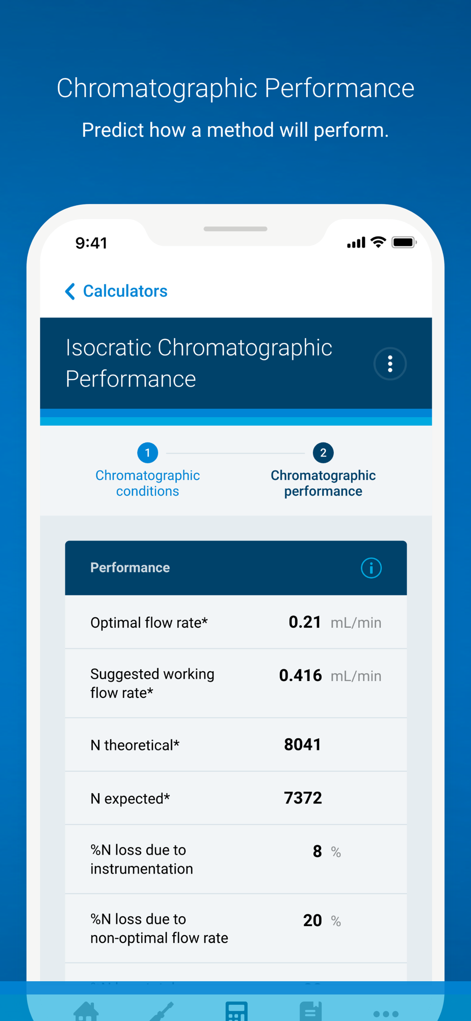 This calculator helps you predict how a chromatographic method will perform. Fill in parameters such as column geometry, system dwell volume, mobile phase, experimental conditions, etc. Then, this app will calculate the expected chromatographic performance (e.g., gradient slope, number of plates, peak capacity, backpressure, optimal flow rate). For all fields in these calculators, you can either use default values or values that are specific to your method, column, and system. All results can be saved as a PDF.
