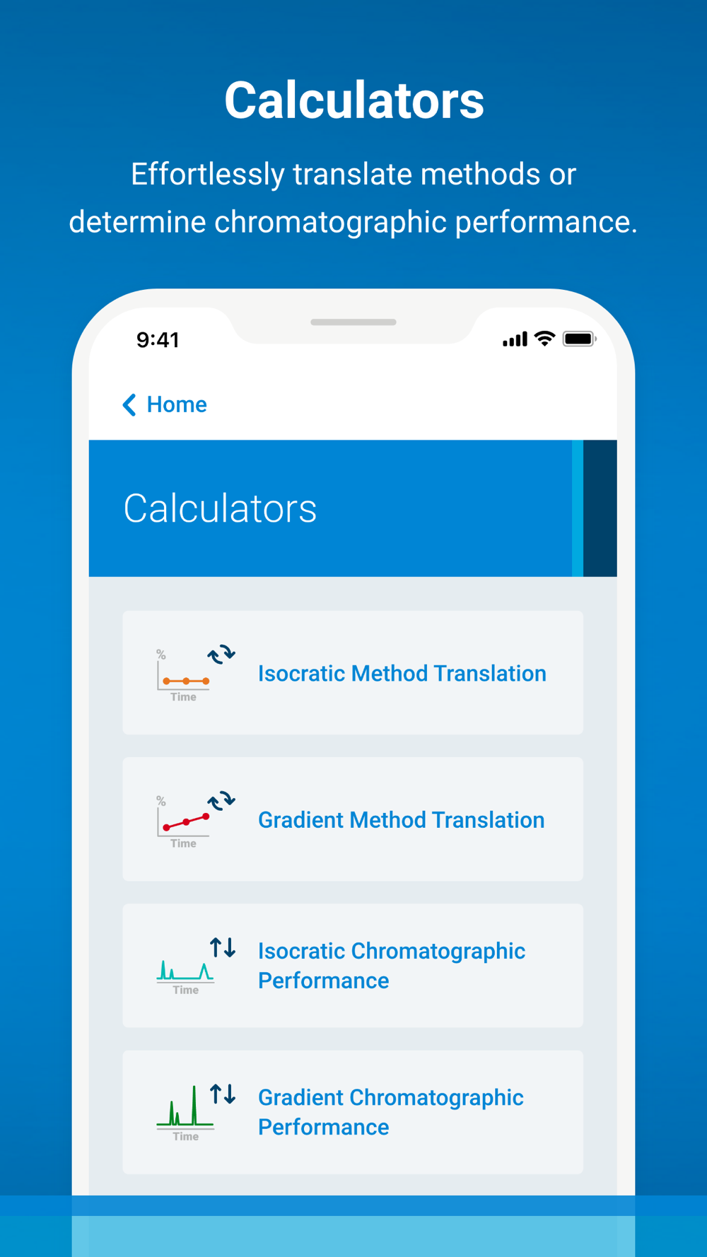 This calculator helps you translate your legacy methods to new columns and systems. Simply enter the information from your legacy method (column, system, experimental conditions, and gradient) along with the new column and system that you are going to use. Then, the calculator determines the experimental conditions and the gradient of your new translated method. For all fields in these calculators, you can either use default values or values that are specific to your method, column, and system. All results can be saved as a PDF.