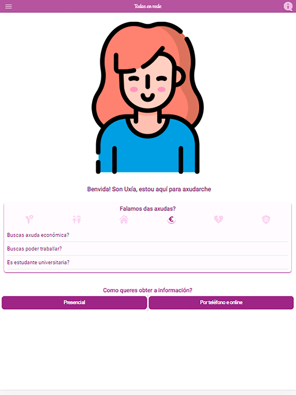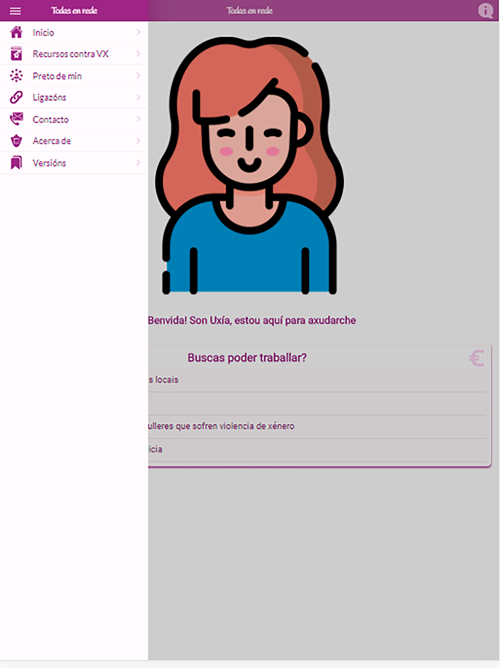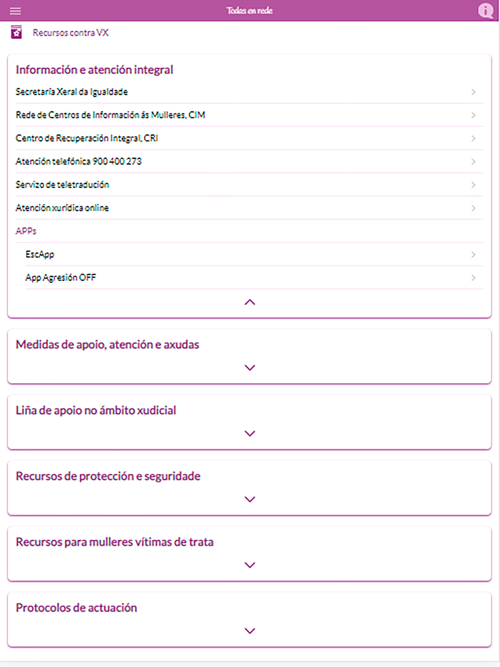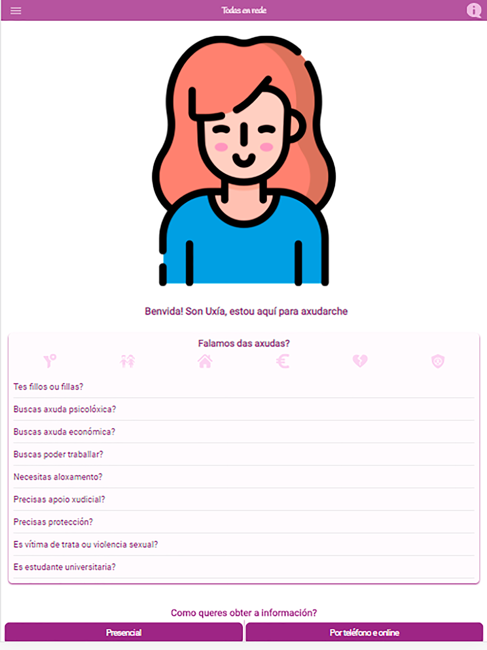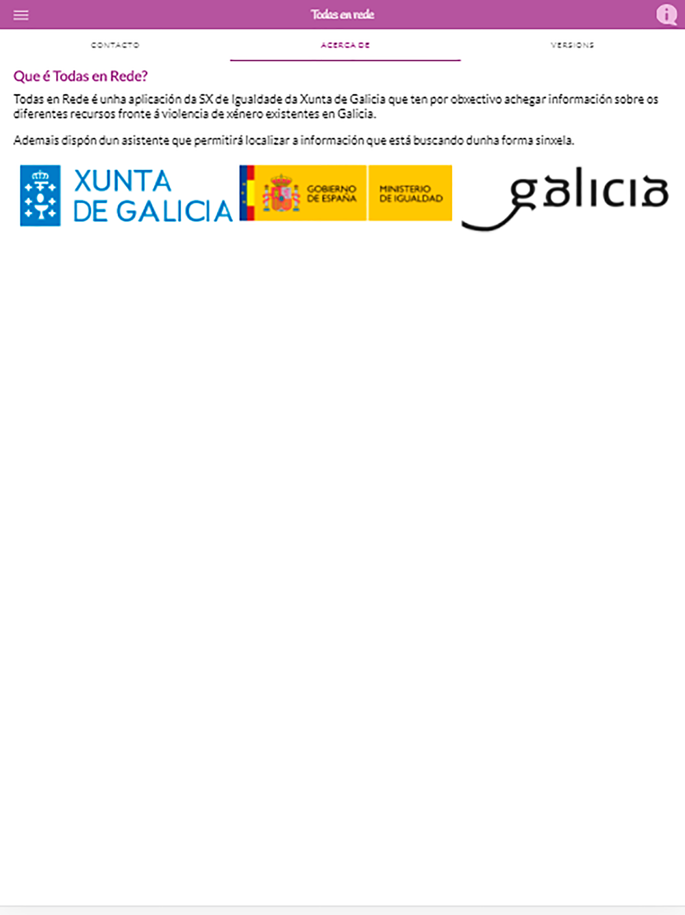Todas en Rede es una aplicación de la Secretaría Xeral da Igualdade de la Xunta de Galicia que tiene por objetivo ofrecer información sobre los diferentes recursos frente a la violencia de género existentes en Galicia. Además dispone de una asistente que permitirá localizar la información.