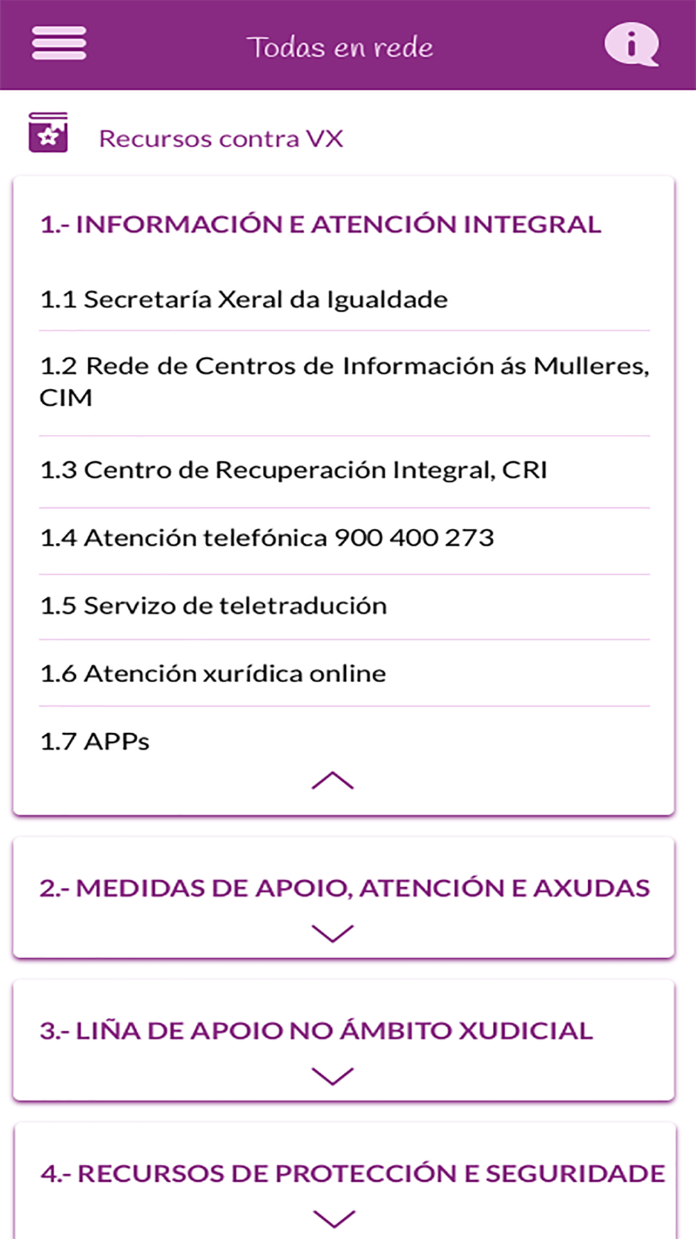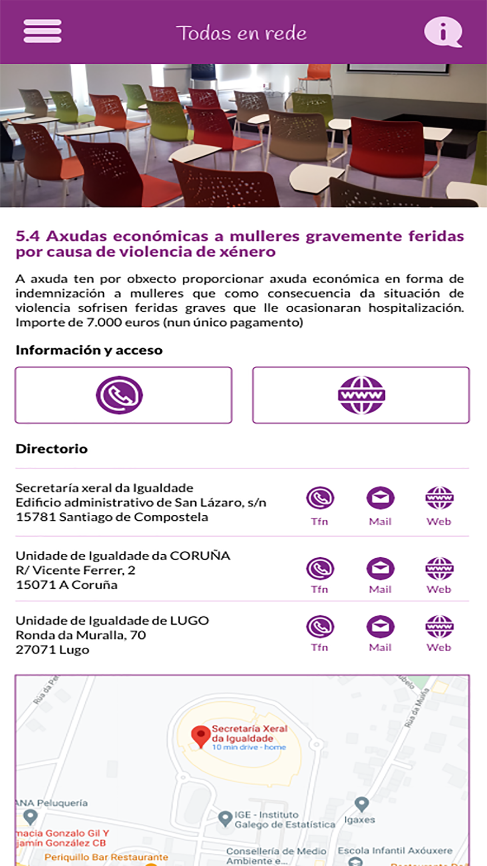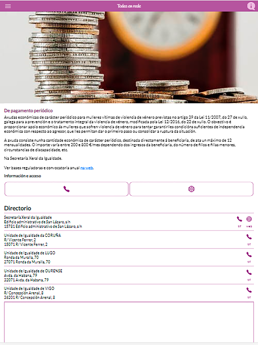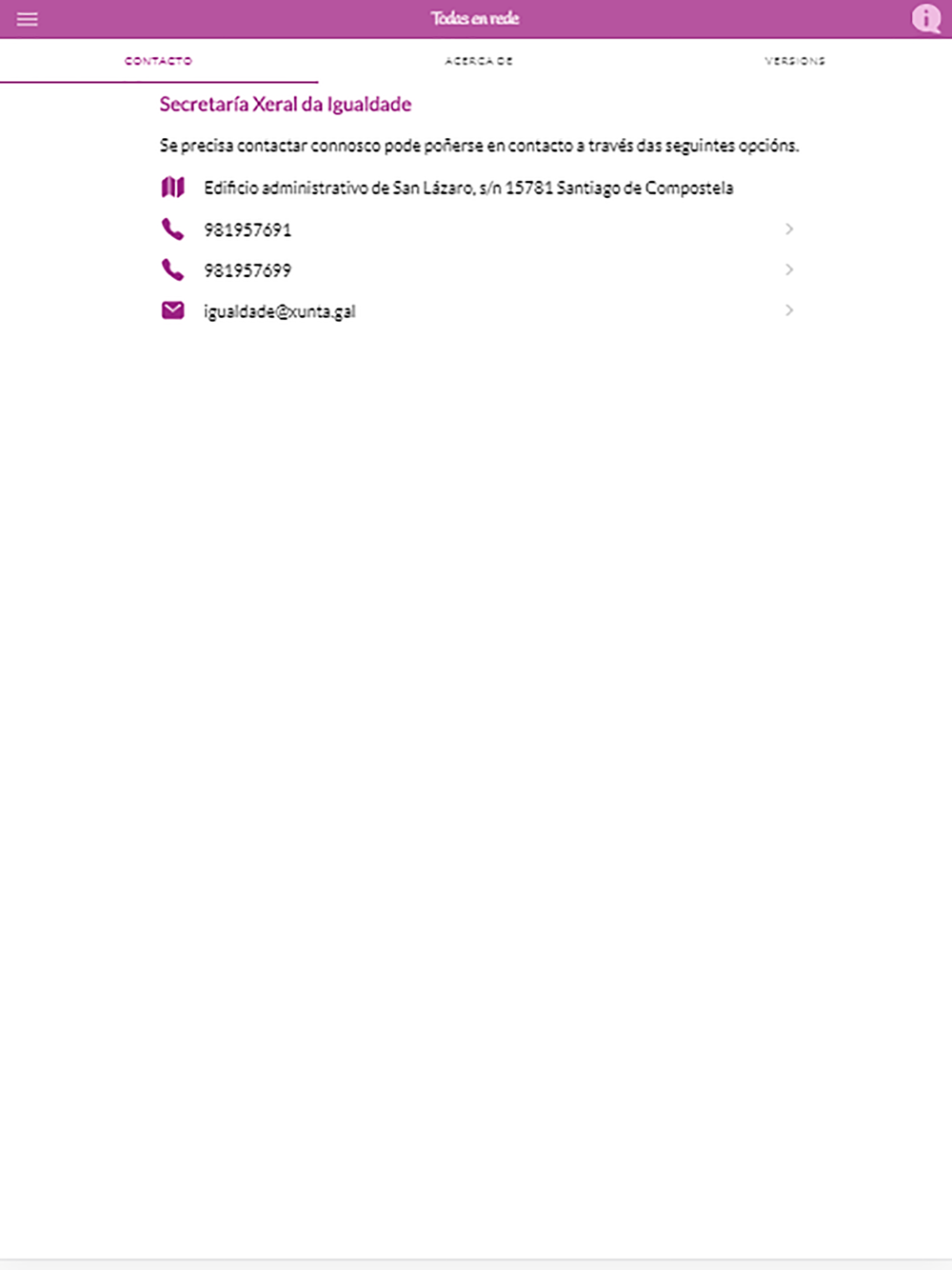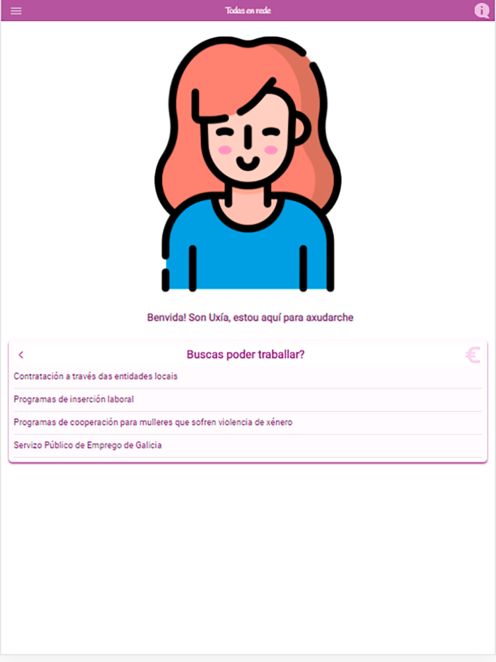 Todas en Rede es una aplicación de la Secretaría Xeral da Igualdade de la Xunta de Galicia que tiene por objetivo ofrecer información sobre los diferentes recursos frente a la violencia de género existentes en Galicia. Además dispone de una asistente que permitirá localizar la información.