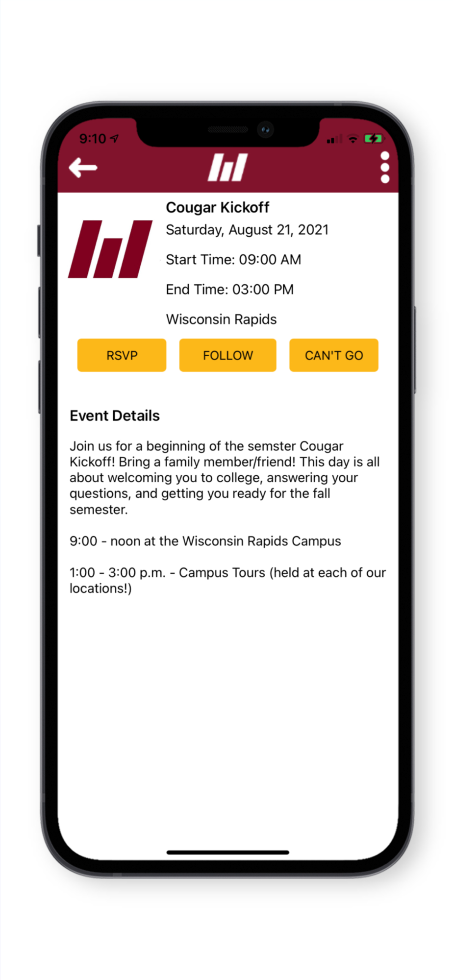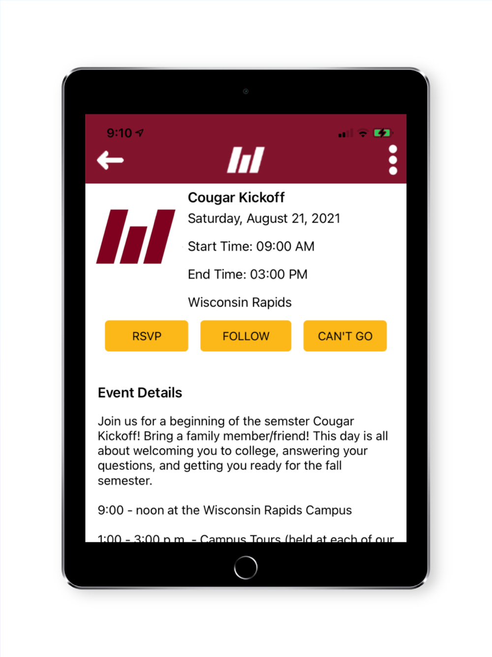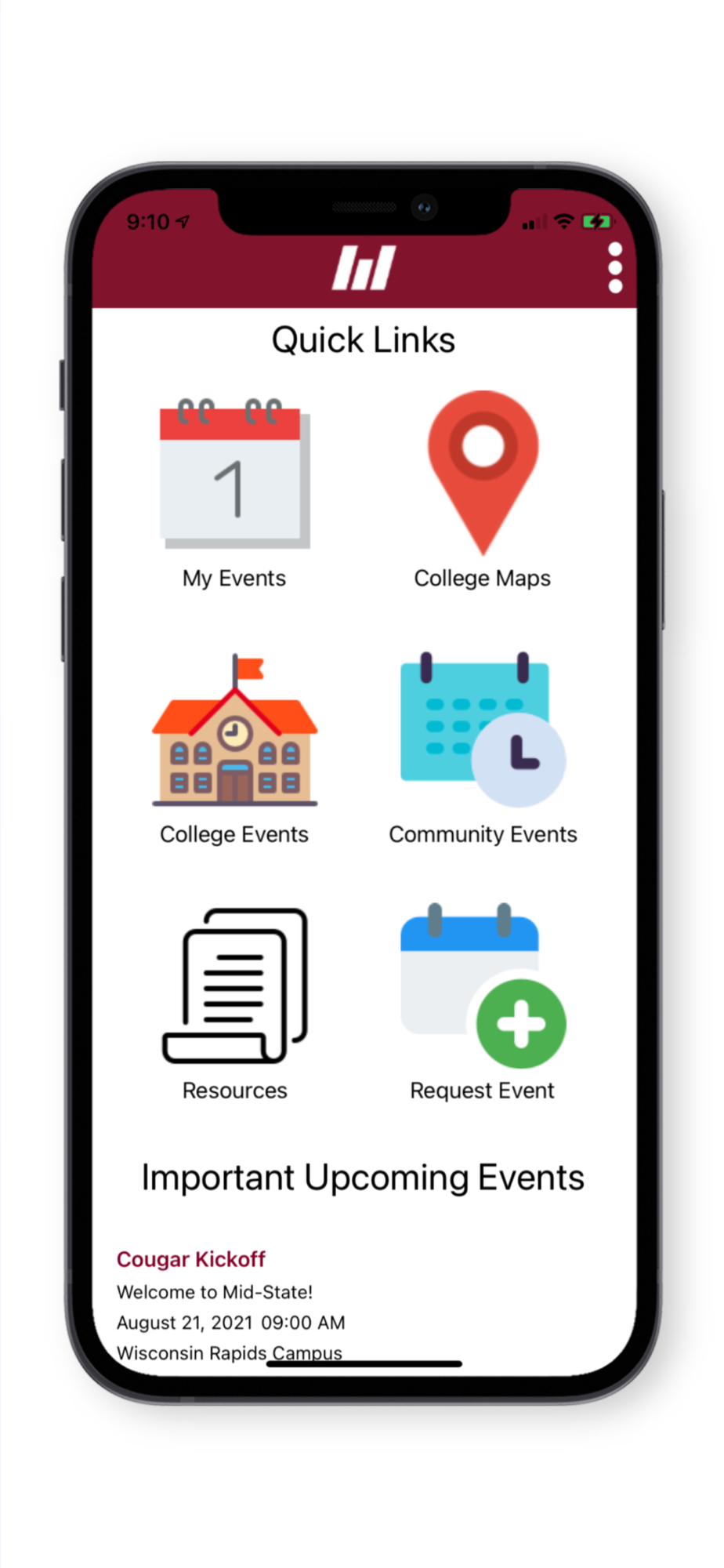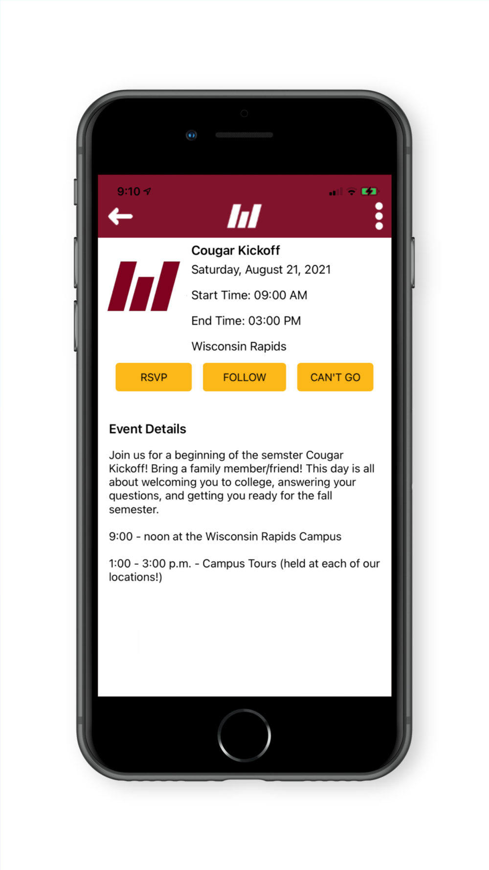 Use this app to get involved with student life and club events, check out local community events, view campus maps, find resources, and stay informed of important dates.