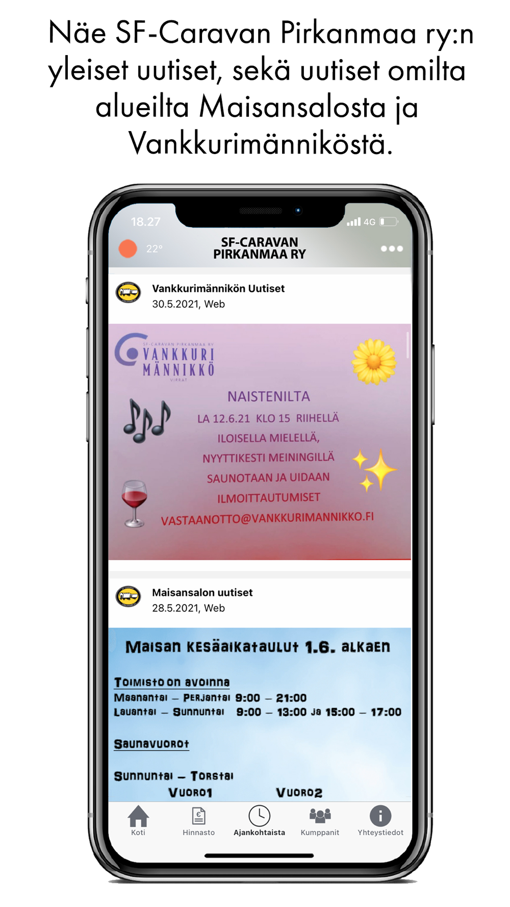Sovelluksesta löydät SF-Caravan Pirkanmaa ry:n yleisten uutisten lisäksi omien alueiden Maisansalon ja Vankkurimännikön tuoreimmat uutiset.