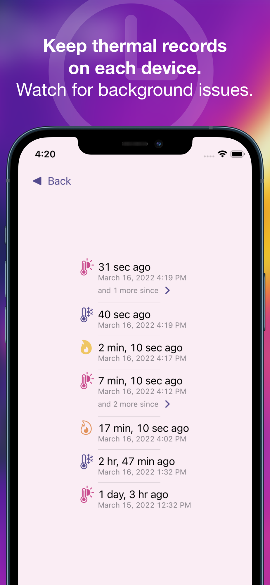 Phone running slowly, charging slowly or low brightness? See if your device is overheating using Thermals. Thermals displays your devices thermal state, as well as how many processors are active on your device and its uptime, as reported by iOS. Thermals helps troubleshoot: Poor performance iOS reduces processor speed and potentially disables processors temporarily when the device is hot. Slow charging battery charging causes a lot of heat and iOS can limit charging speed to reduce the additional heat that might make a device too hot. Low maximum brightness if your device screen stays dark despite being on full brightness, it could be limited by iOS due to heat. Manufacturing defects if not all processors are active when the device is cool and not in low power mode. Your device's thermal state is monitored regularly in the background and recorded in the app (if Background App Refresh is enabled). Open the app or tap the widget to record a data point manually. Export the raw data to file for corroboration with Screen Time, Xcode's Instruments, or other development tools. Also an independent Apple Watch app shows the thermal status, active processors and uptime, and thermal history of your watch.