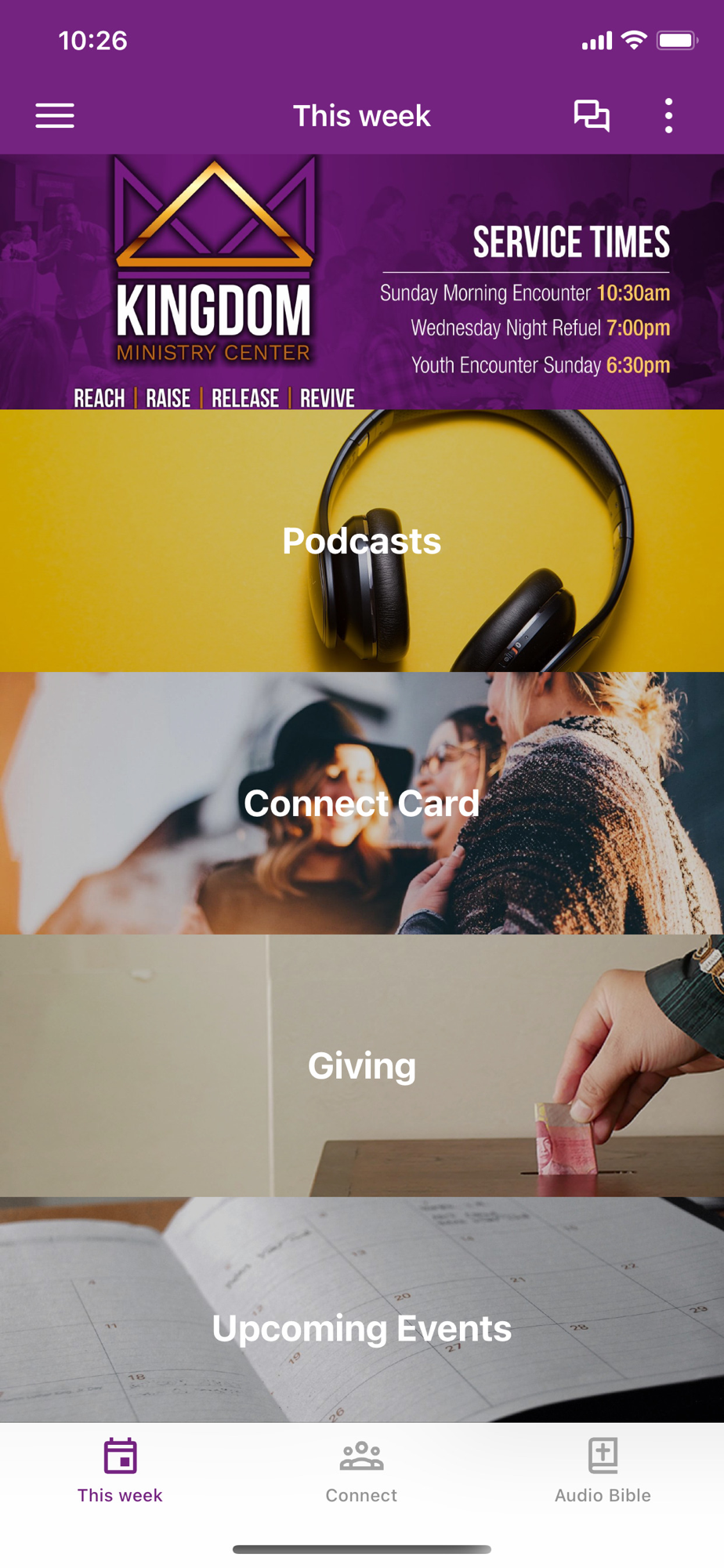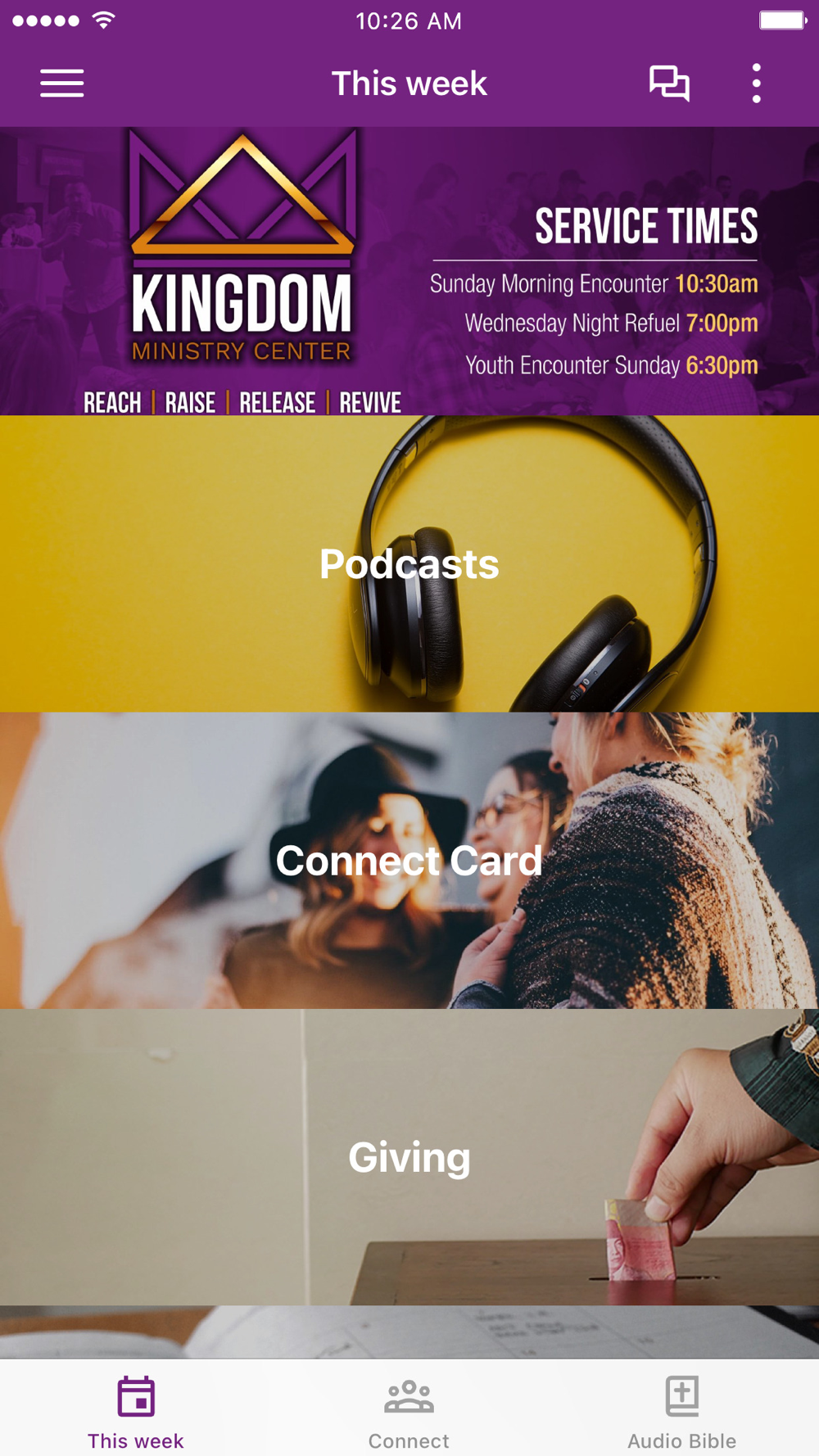 This app will help you stay connected with the day-to-day life of Kingdom Ministry Center. With this app you can: watch or listen to past messages; stay up to date with push notifications; share your favorite messages via Twitter, Facebook, or email; and download messages for offline listening.