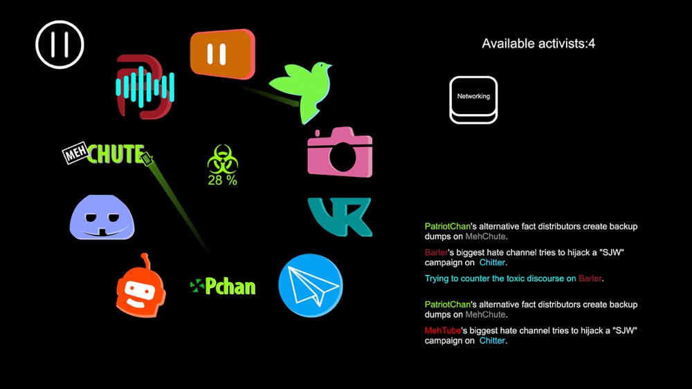 Your aim is to keep the hate campaign at bay while managing to convince major platforms to stop the hate speech. To do so you have access to the activist’s toolkit: counter speech, reporting, networking, monitoring and deplatforming.
