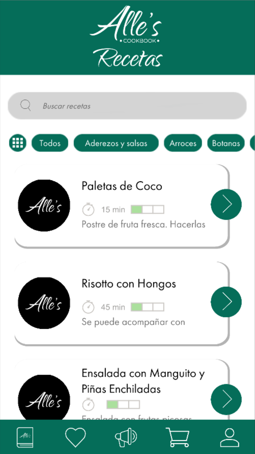 • Recetas con indicadores de dificultad, indicadores de tiempo, ingredientes e instrucciones.