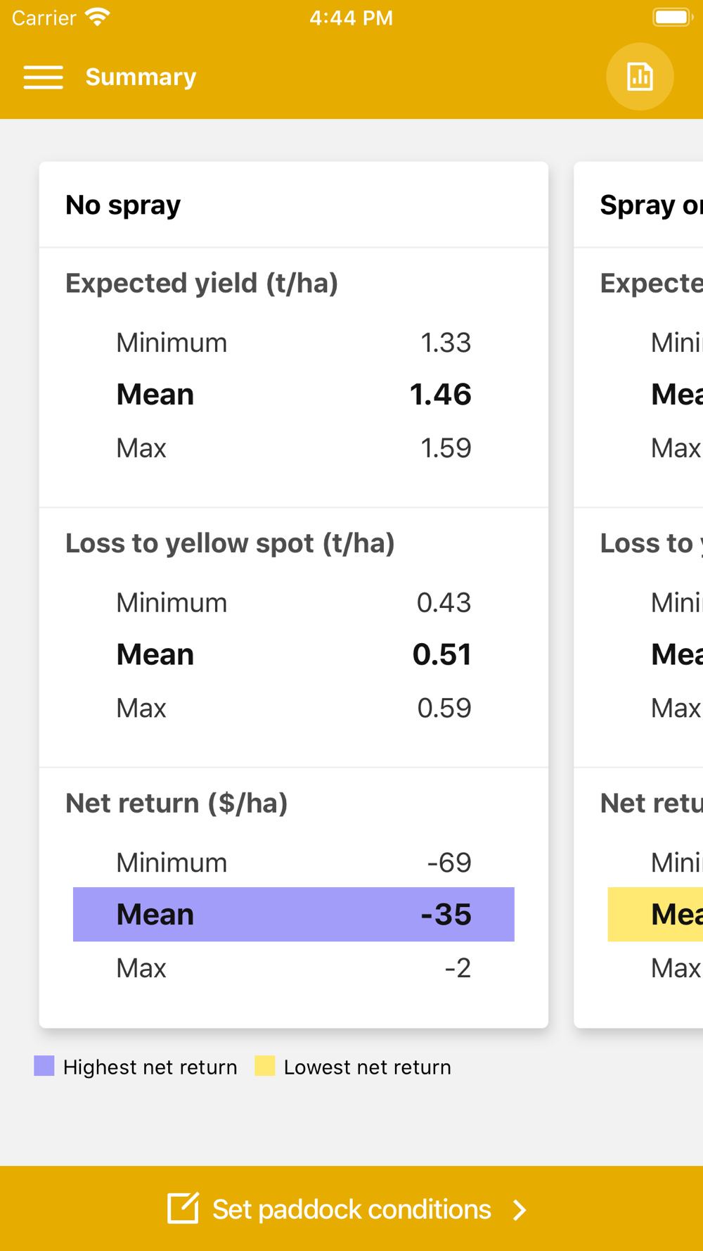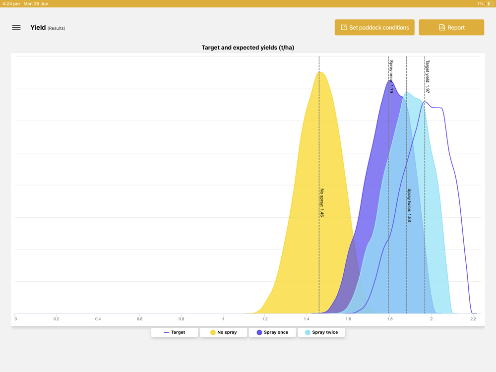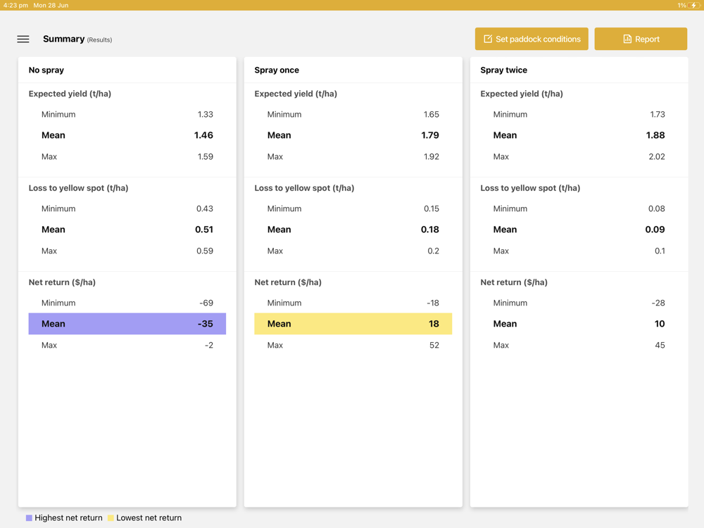 YellowSpotWM takes account of costs, yield benefits, grain price, and seasonal conditions to give best case, worst case and most likely estimates of financial return from a fungicide application.
