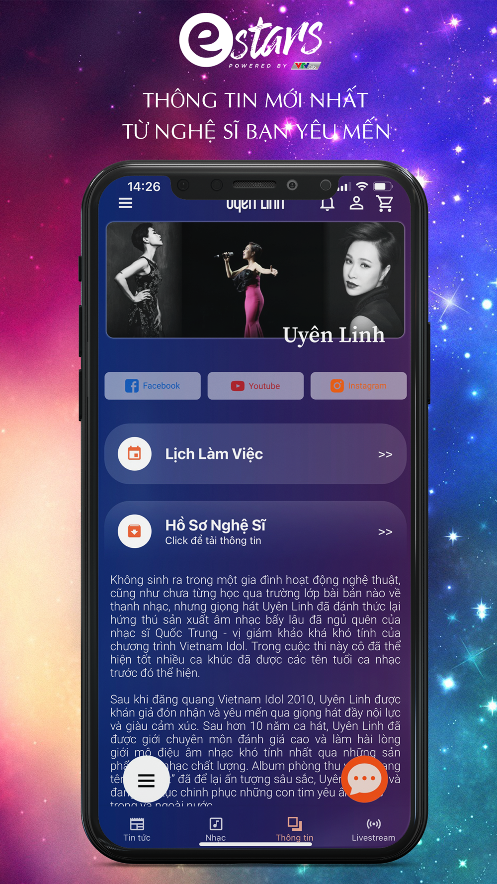 Chào mừng bạn đến với Ứng dụng Uyên Linh. Với ứng dụng, bạn có thể nhanh chóng cập nhật tin tức mới nhất về nữ ca sĩ. Ngoài ra, bạn còn có thể tương tác, giải trí cùng với kho nhạc và video cực hấp dẫn của Uyên Linh.