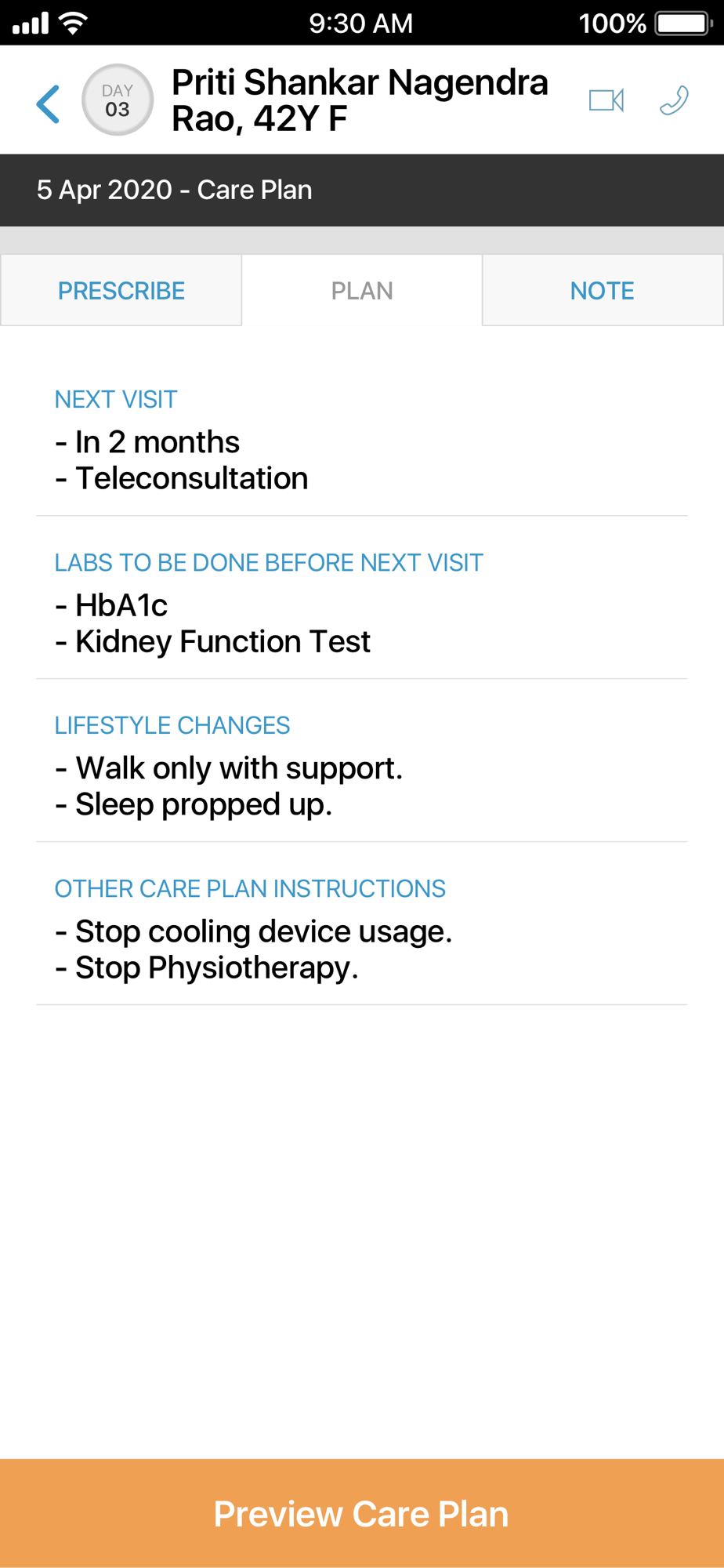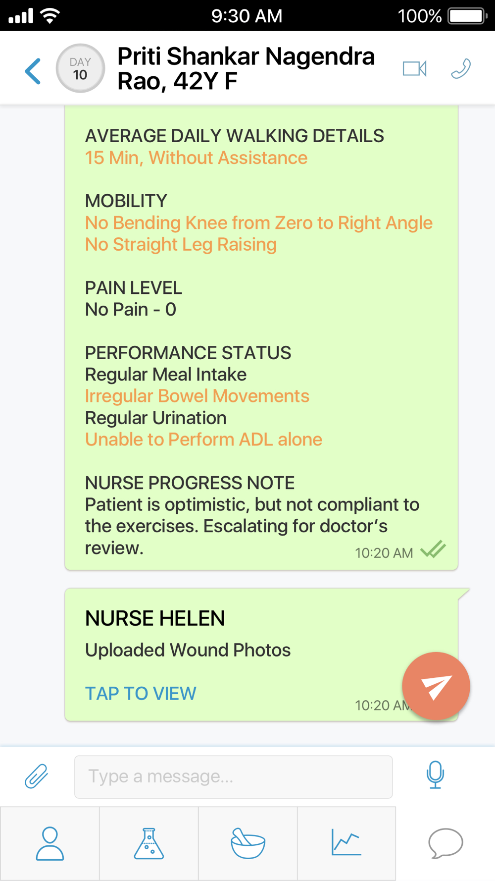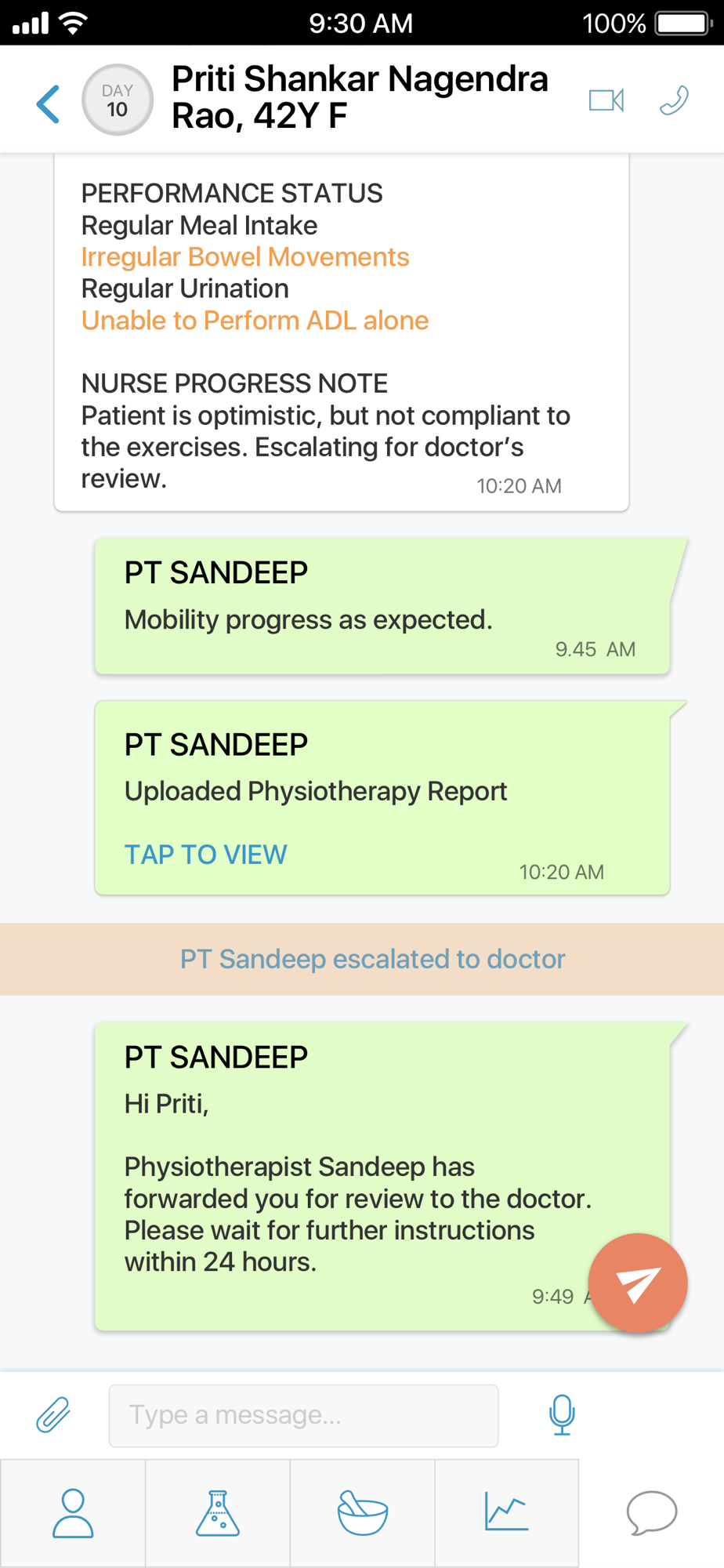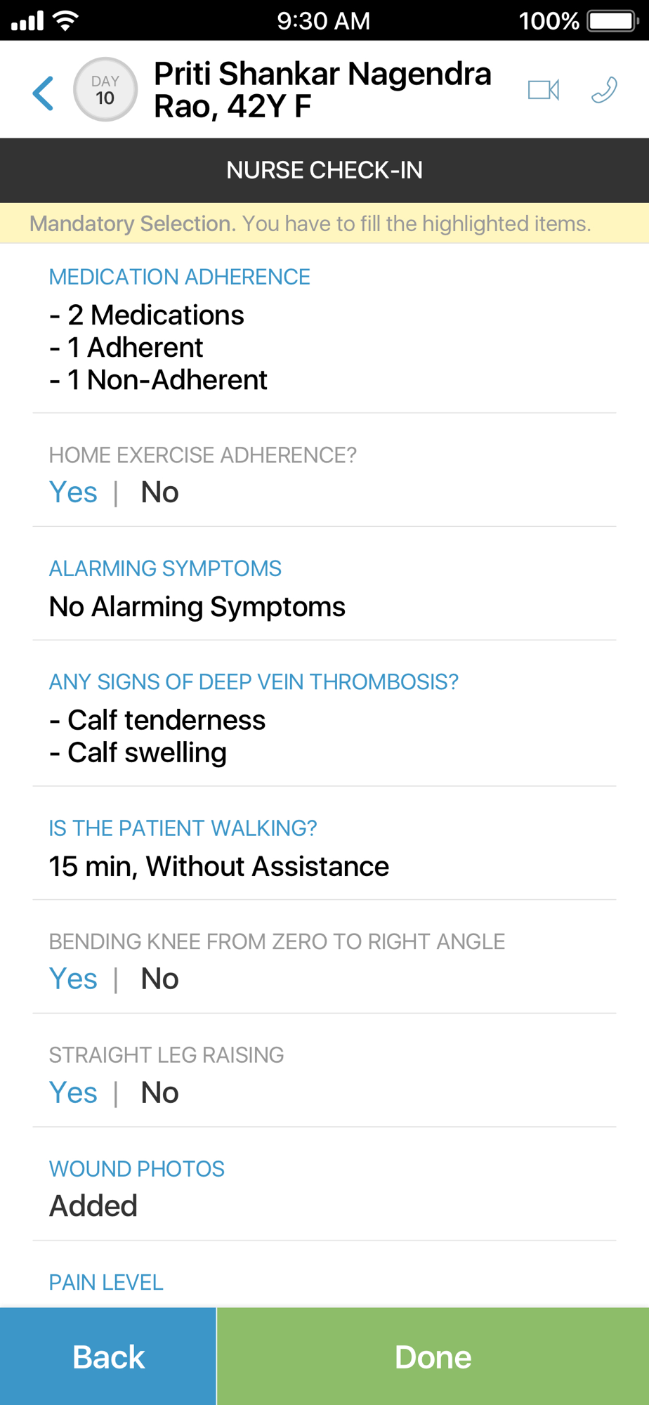The application helps the care team manage their patients through their recovery remotely. Eligible patients are onboarded by a nurse on the smartphone app. Patients use the Patient App to add their daily check-ins of vitals and symptoms, if any. Nurses are immediately alerted of adverse information logged in, allowing quick followup with patients. Doctors generate digital care plans for the patient remotely. The system enables care continuity and prompt feedback loops between the patient and their care team members.