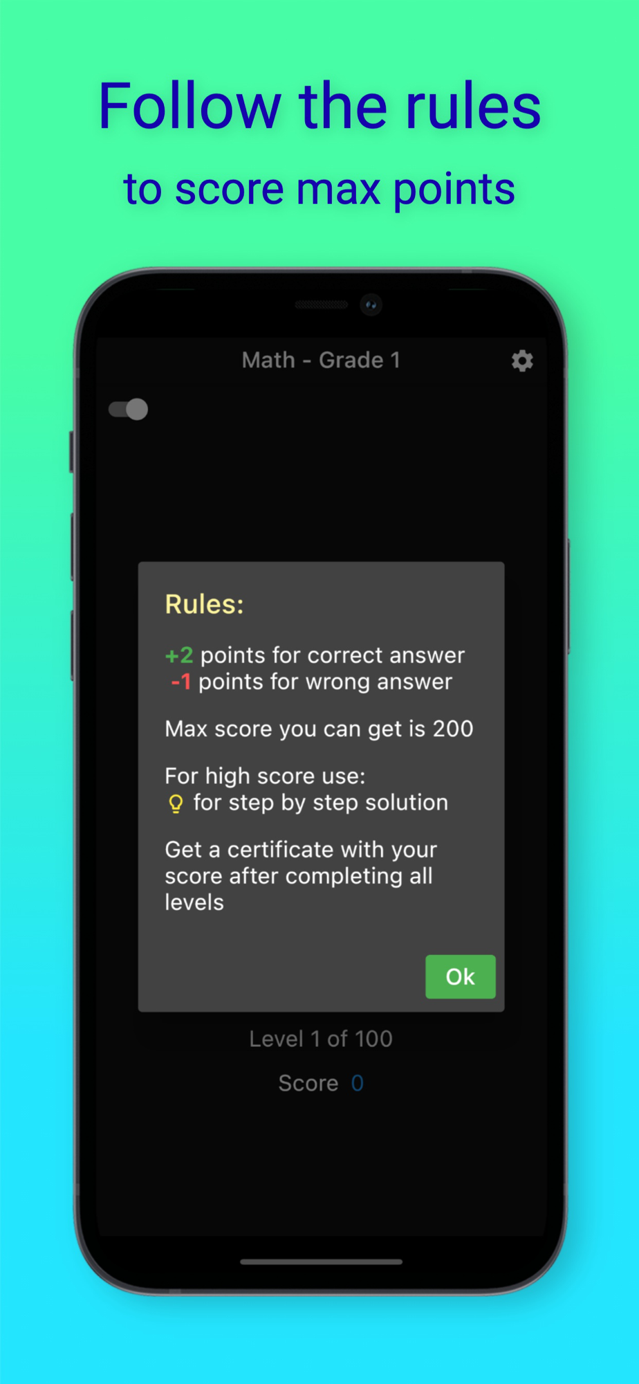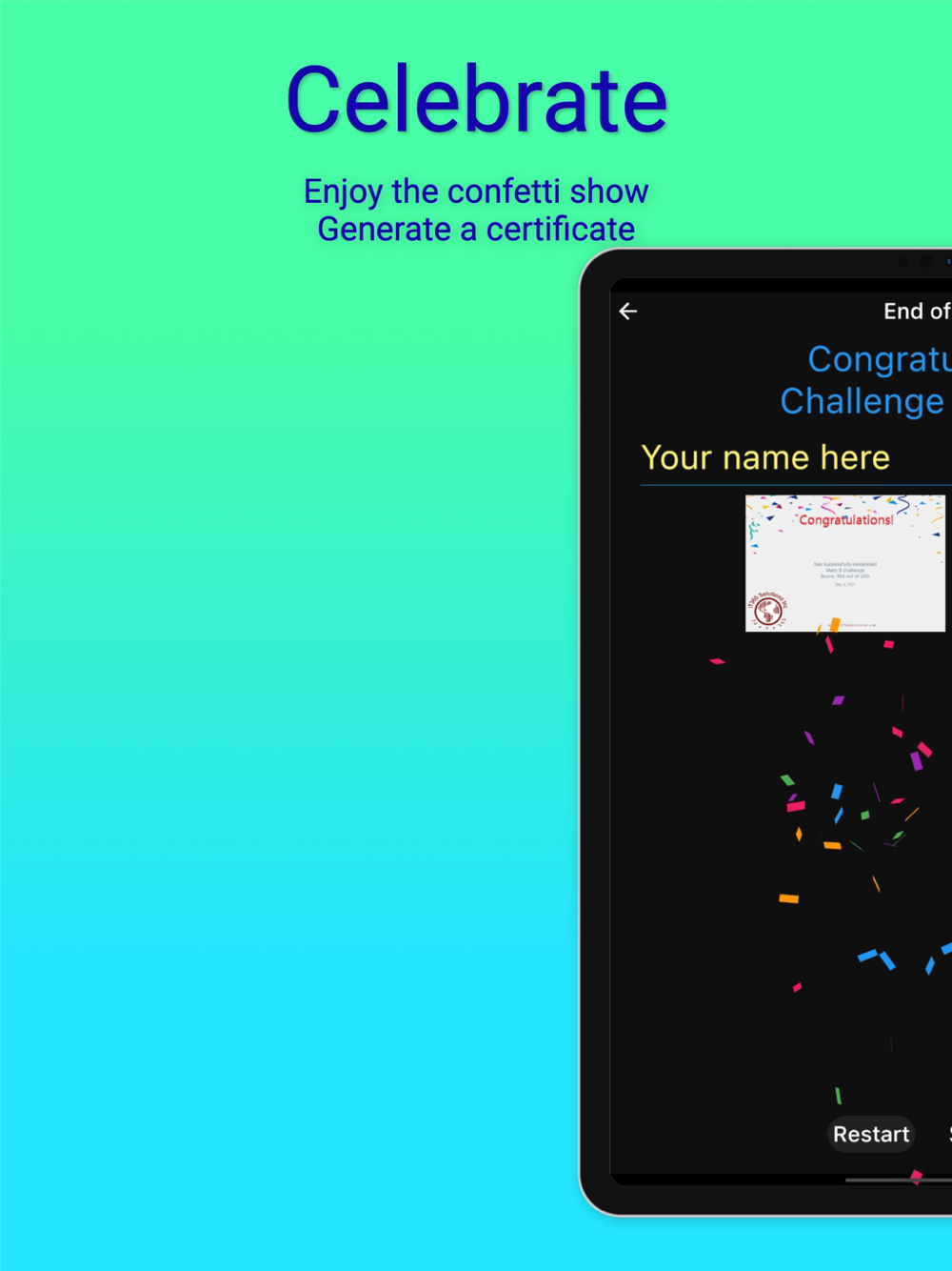 Educational 1st Grade Math with fun questions. Create and share a certificate of your final score. Challenge your friends to see who can score the most.