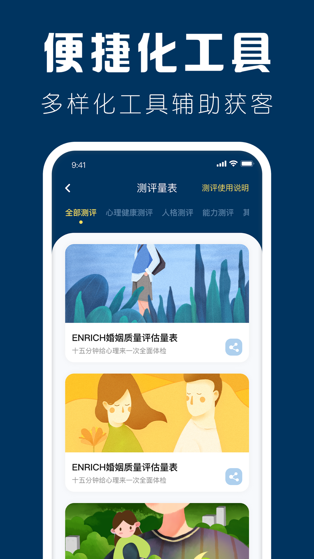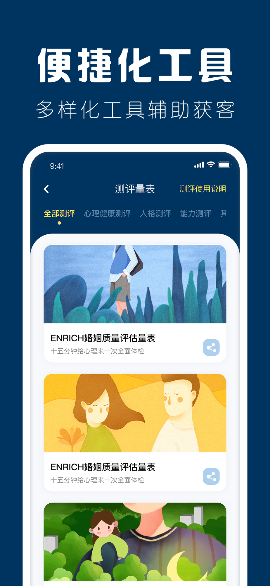 【咨询工具】提供心理测评等辅助工具,提升咨询预约量和咨询效率。