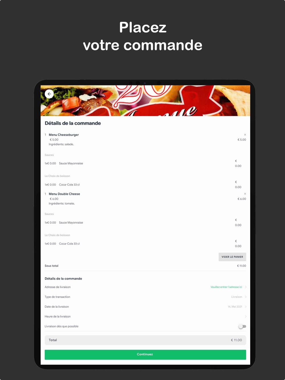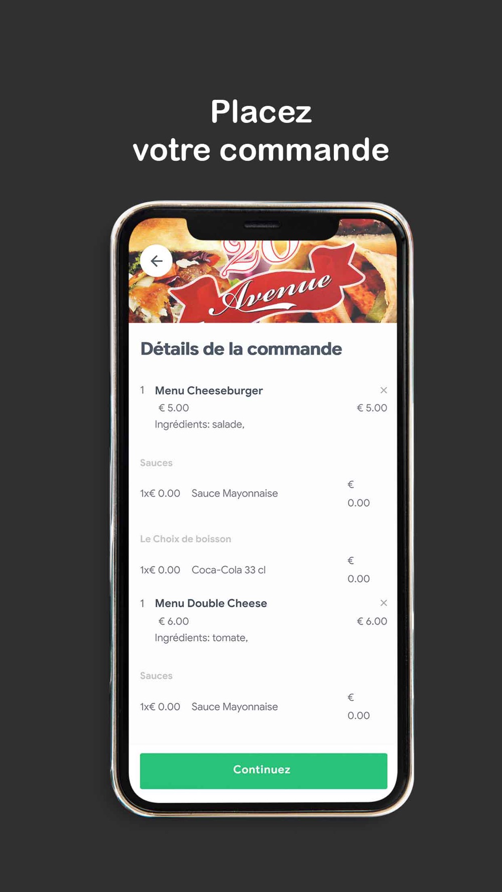 Composez votre menu sur notre Application et Commandez vos plats préférés de la carte 20ème avenue restaurants fast food, choisissez votre mode de paiement, passez commande et vous n'avez plus qu'à patienter.