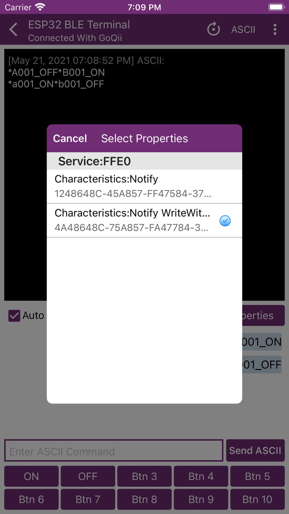-- This app can send and receive commands via BLE so you can debug your ESP32 based hardware problems easily.