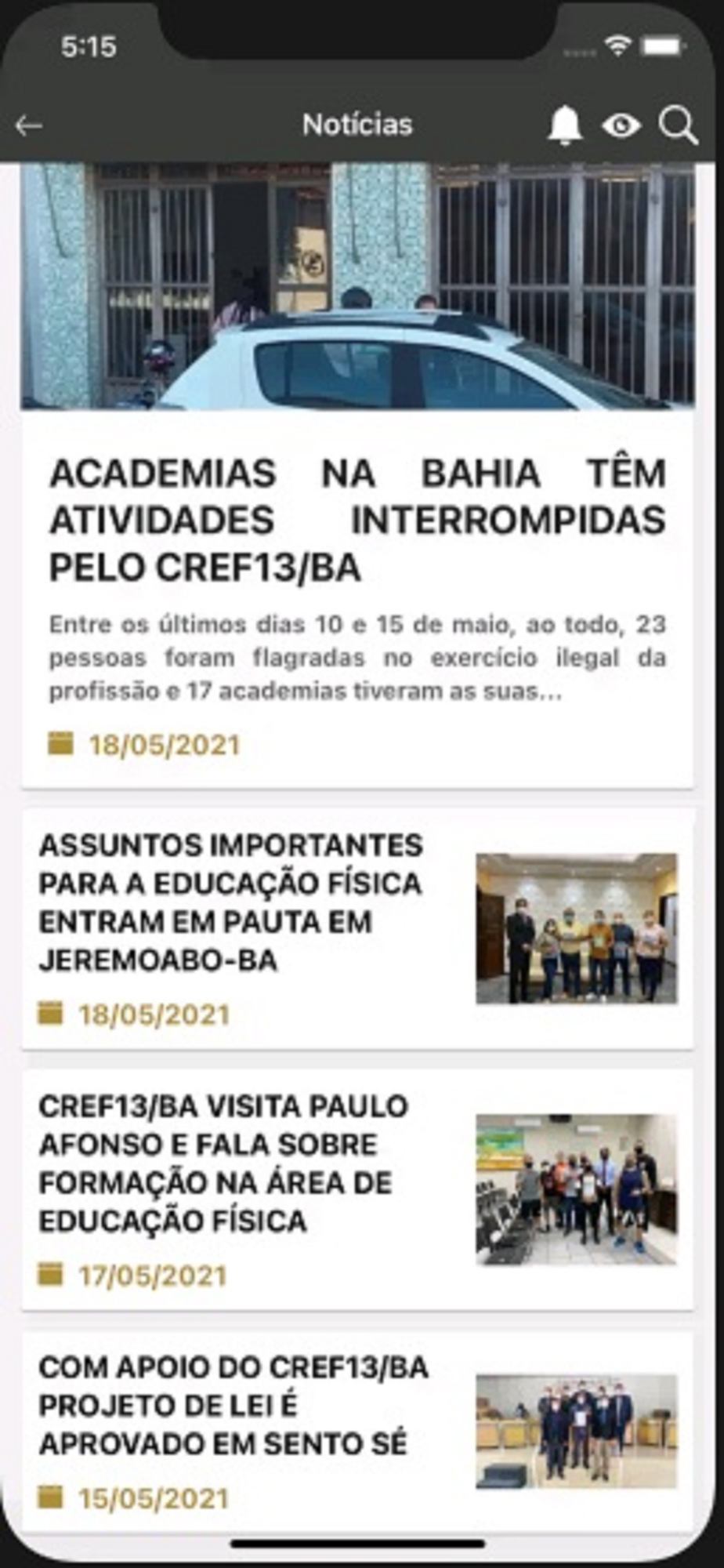 Aplicativo do CREF13/BA contendo notícias do conselho, a possibilidade de consultar e alterar dados cadastrais e realizar pagamento das anuidades do conselho.