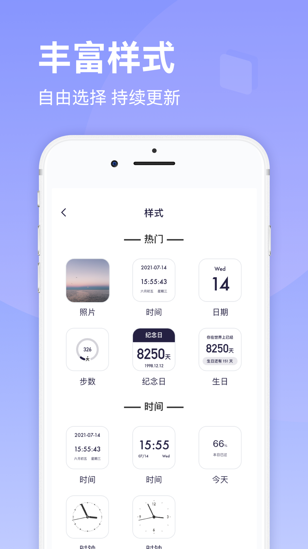 Fully adapt to iOS14, carefully design a variety of desktop widgets, including clocks, photos, countdowns, anniversaries, progress percentages and other components, a variety of combination styles can be matched freely, simple and stylish. It supports custom component backgrounds, fonts, etc. You can use it to easily create individual components to make your desktop unique.