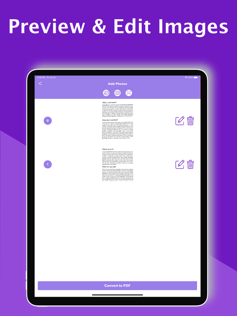 Take photos of documents or scan it then convert to pdf by one click. Choose from predefined Photo layouts. Convert jpg to pdf to easily print one or more photos on a page.Simple and intuitive interface makes PDF Photos the easiest JPG to PDF Converter