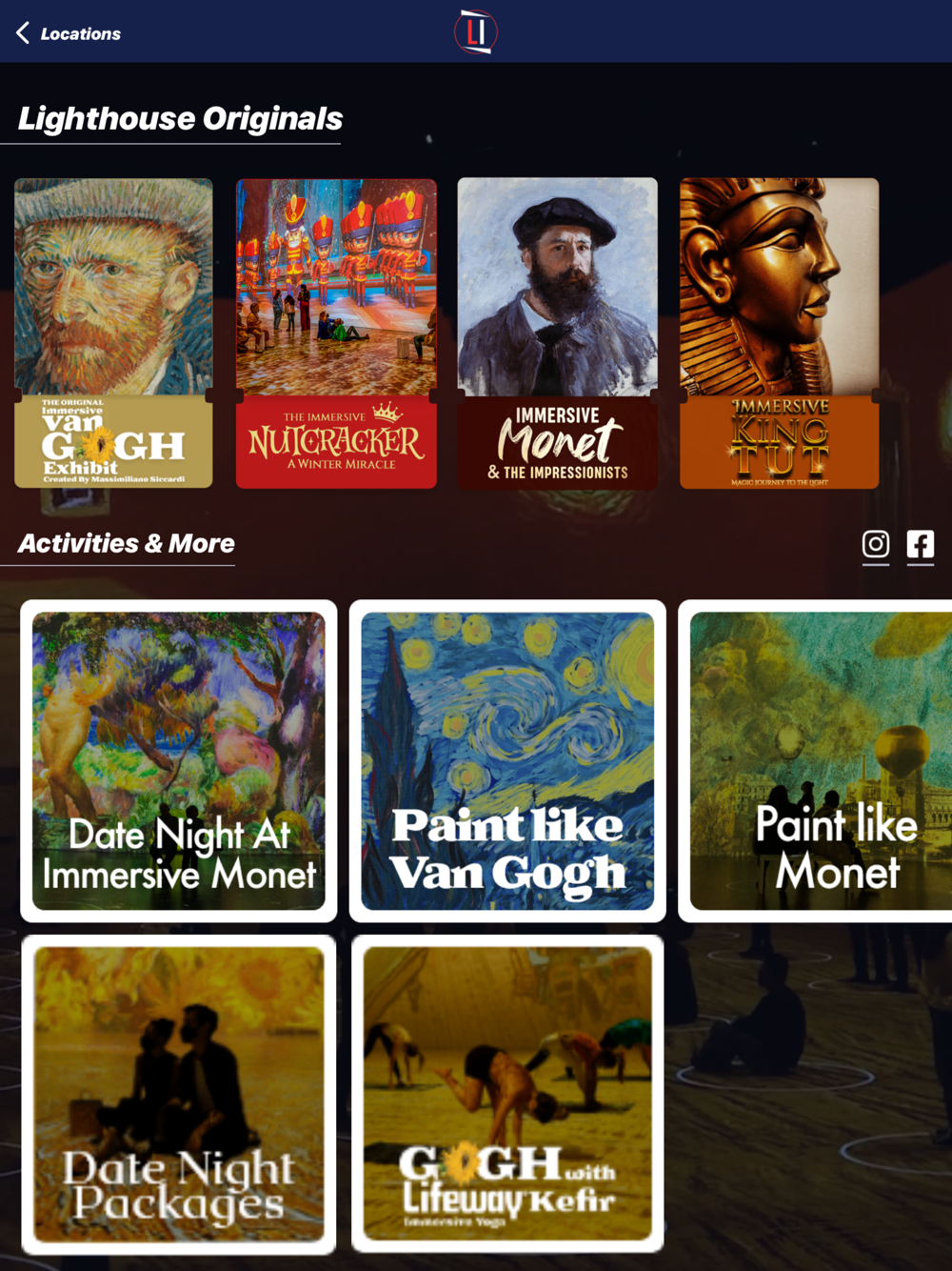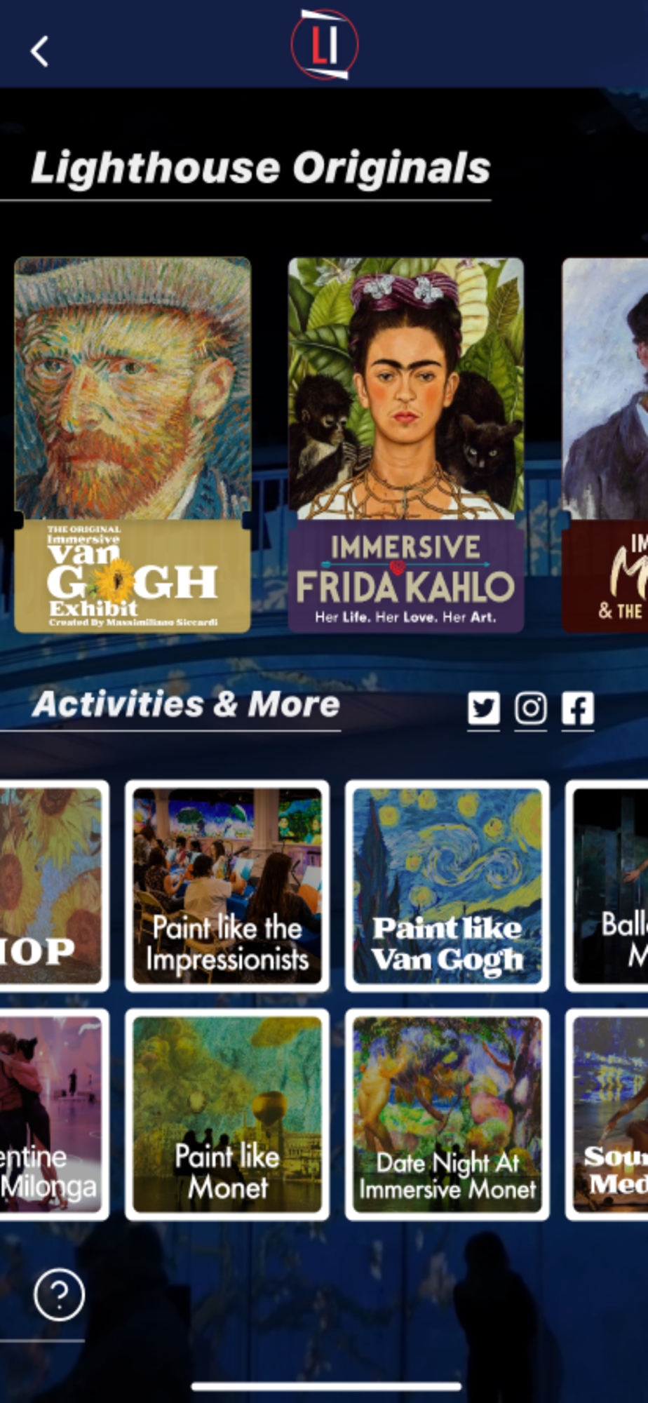 Following the blockbuster Immersive Van Gogh Exhibit, Lighthouse Immersive has become the leading producer of immersive experiences in North America. Lighthouse ArtSpace venues can be found in major cities, showcasing state-of-the-art video mapping technology that immerses you in art, music, and more. The Lighthouse Immersive app provides additional information on exhibits and experiences. From audio guides to behind-the-scenes info, and fun facts, and more, take your visit to the next level with the Lighthouse Immersive app.