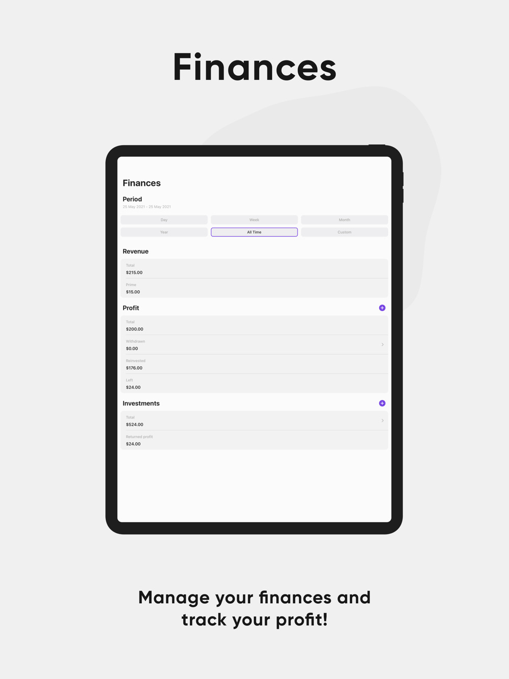 - Finances - manage your finances and track your profit without a ton of financial accounting!