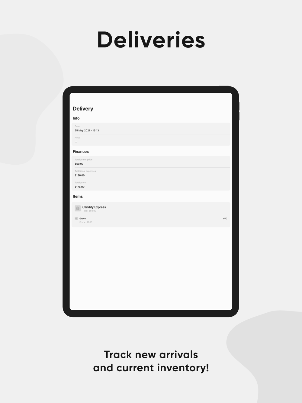 - Deliveries tracking and current stock - no need to recalculate everything manually, just add the new delivery and enjoy!
