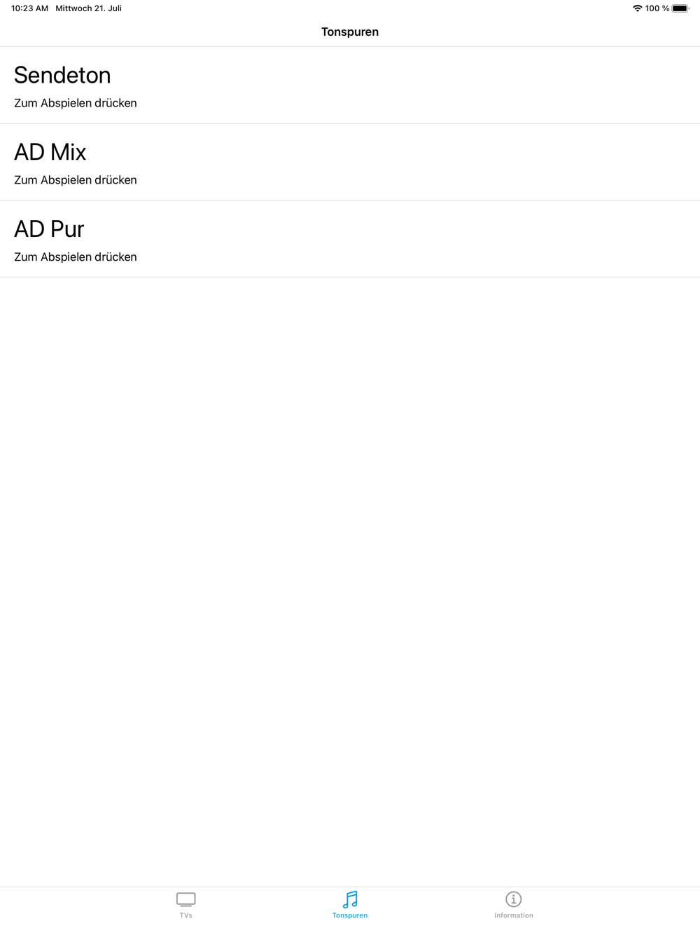 - Kopplung des Smart-TV Gerät mit dem IPhone/IPad für die lippensynchrone Wiedergabe zur Fernsehsendung via BR-Startleiste und HbbTV-Apllikation „BR Audiodeskription“
